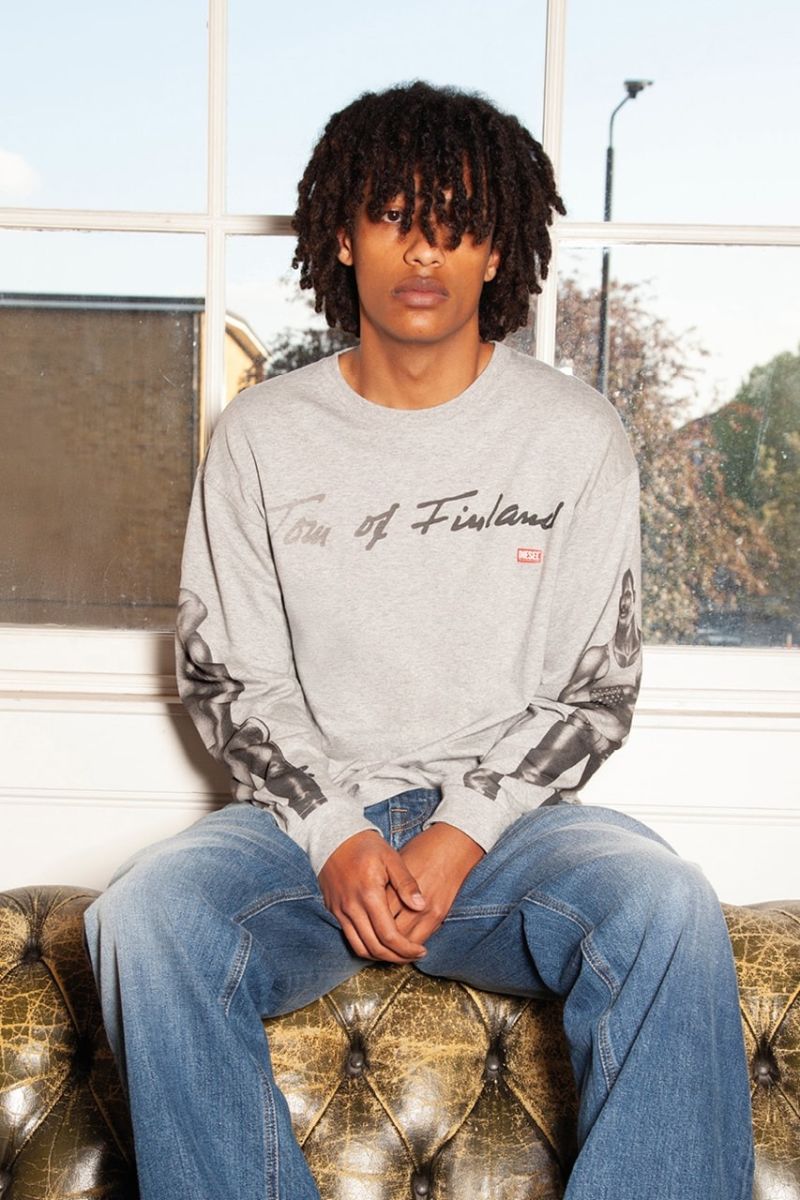 La gran mayoría de las prendas de Diesel X Tom of Finland se cargan con fotos, más que con ilustraciones. Por ejemplo, tenemos un set de camisa camp y bermudas estampado con los negativos de su archivo. También, tenemos jorts de corte baggy con imágenes de invitados a sus fiestas (vestidos como los arquetipos de su obra). Como piezas más surrealistas, tenemos una sudadera oversize con una foto de un beso desvanecida y un pantalón de chándal baggy con un motero. Una photo tee con una espalda tatuada y un top de sheer cierran este armario visual.