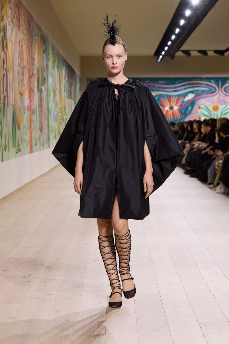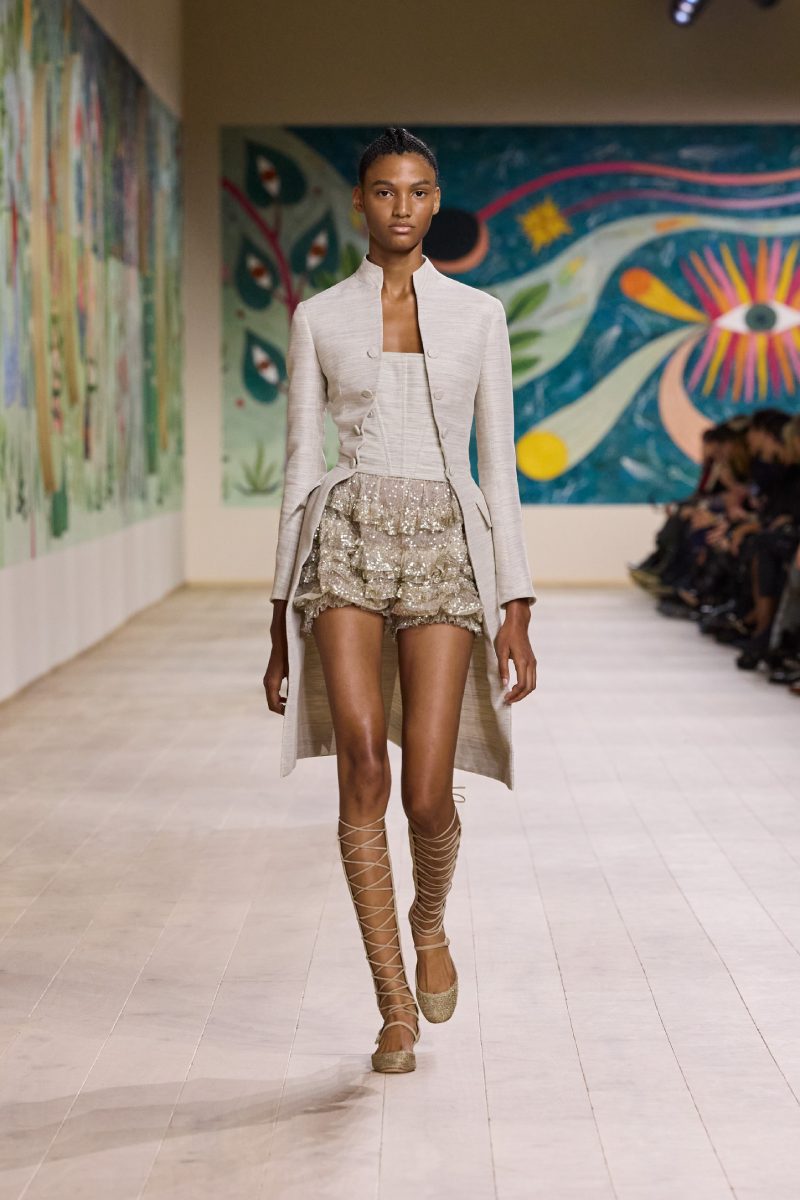 Según Chiuri, Dior Alta Costura SS25 es la oportunidad perfecta para hacer despertar temas esenciales de memoria sartorial. Para ello, toma inspiración de la creatividad de siglos pasados y amalgama tropes y guiños de distintas épocas; que no se sienten ni historicistas ni contemporáneos… están suspendidos en el tiempo, en constante intercambio e interacción.