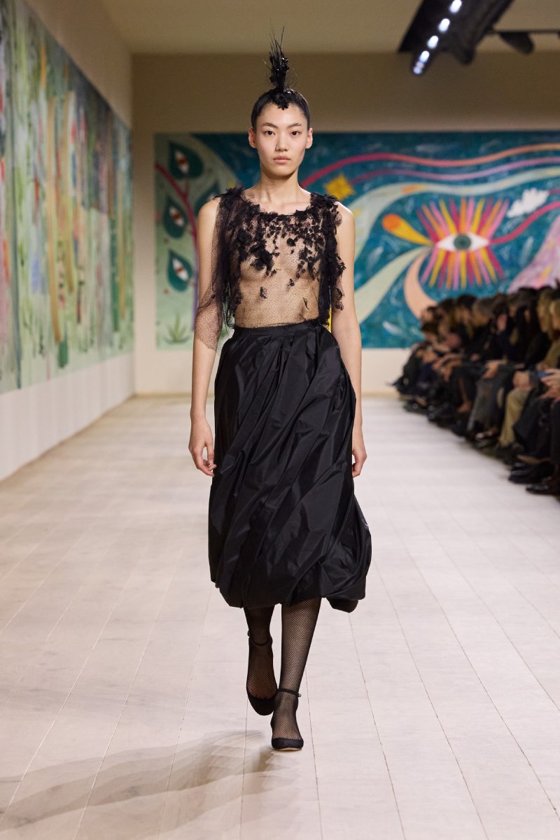 Los looks de eveningwear de Dior Alta Costura SS25 se componen de los elementos más característicos del lenguaje de Chiuri; vistos a través de esta paradoja temporal. La crinolina vuelve al repertorio, y se eleva a través de construcciones más elevadas y acabados más refinados, como coberturas de encaje, plumas negras, y embroidery floral. También vemos un toque más avant-garde con los vestidos (y faldas) de frunces y volantes, que dotan a este armario de proporciones arquitectónicas (casi) imposibles.