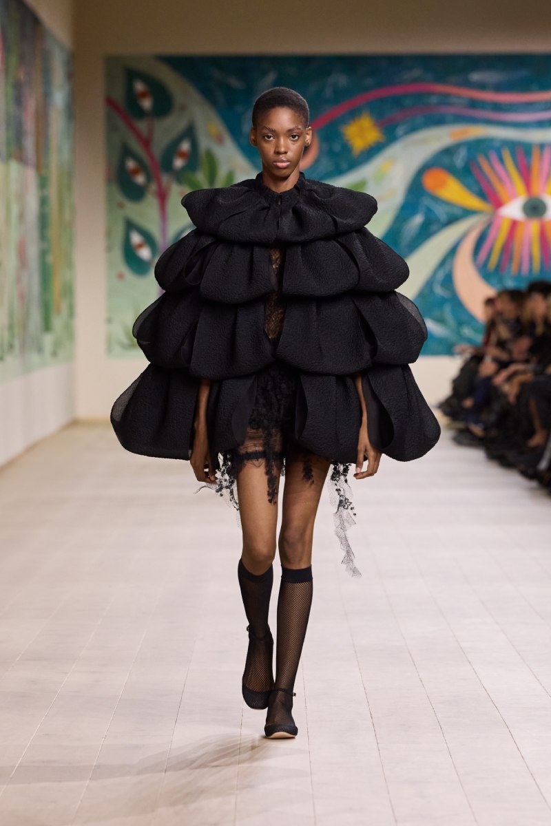 Dior Alta Costura SS25, al ser una colección tan variada y mezclada, compone un universo entero que debe analizarse no cronológicamente, sino conceptualmente. En primer lugar, tenemos los abrigos de inspiración sartorial sublimados por construcciones negras que sirven de antesala y estructura para las demás chaquetas con sus cinturas ceñidas a la New Look. Siguiendo por esta línea sartorial, las americanas y demás piezas de outerwear juegan con las proporciones; contrastando con los volúmenes exagerados de las piezas inferiores.