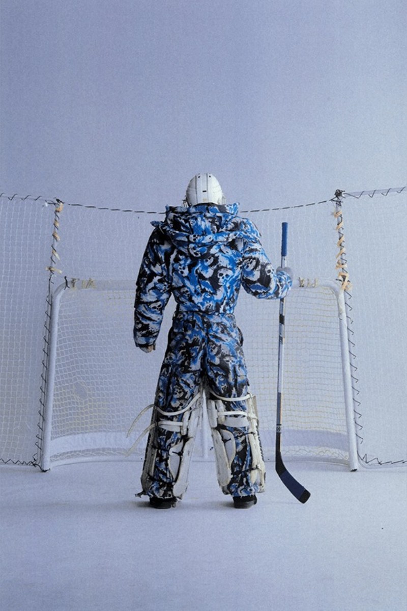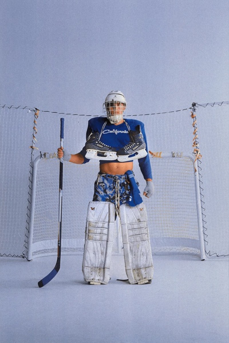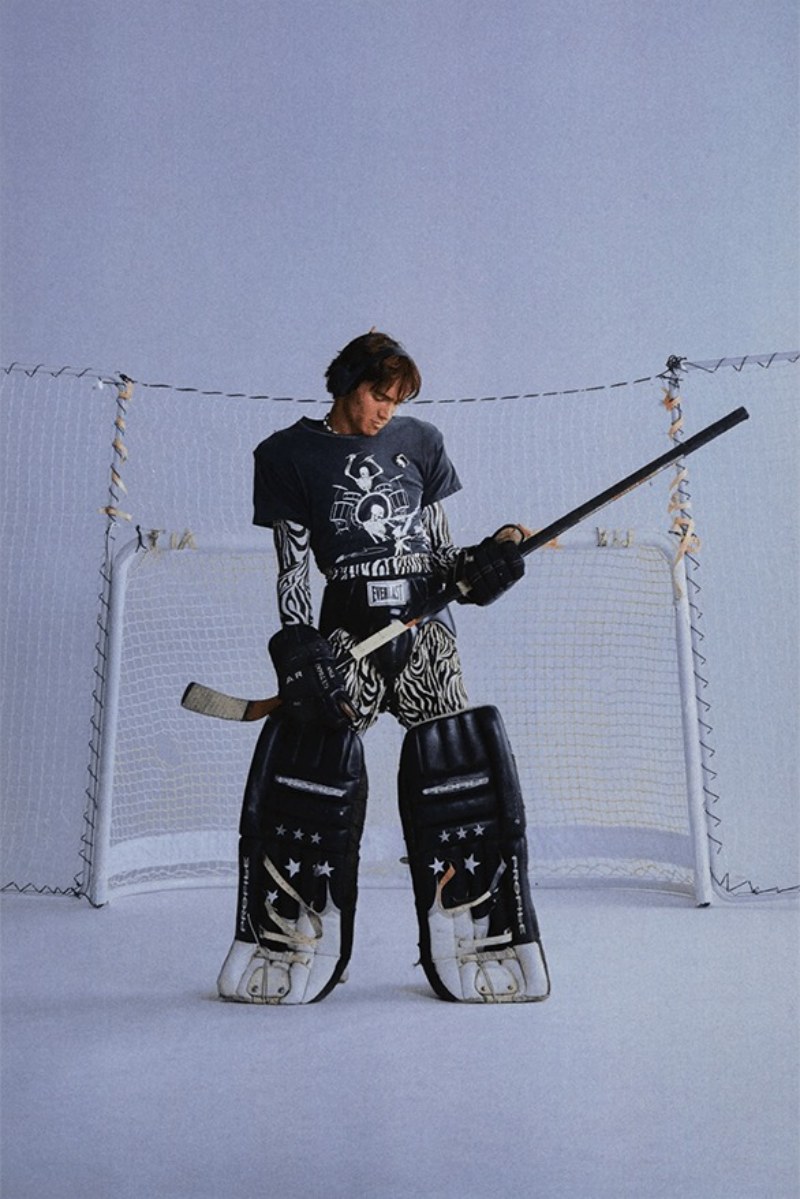 Tras cubrir a los normies o npc’s, la colección se divide en bloques extremadamente dramáticos y definidos. ERL FW24 abre su catálogo de tribus urbanas con los atletas del insti. Aquí, piezas de indumentaria sport reciben una reinterpretación mucho más elevada en looks que solo gritan nostalgia dosmilera. Vemos piezas típicas como camisetas de fútbol americano, hombreras, camisas de hockey, y conjuntos puffer estampados como pilares del nuevo estilo urbano. También, conjuntos de sportswear de chándal se revisitan como sets ceñidos y con cortes cropped.