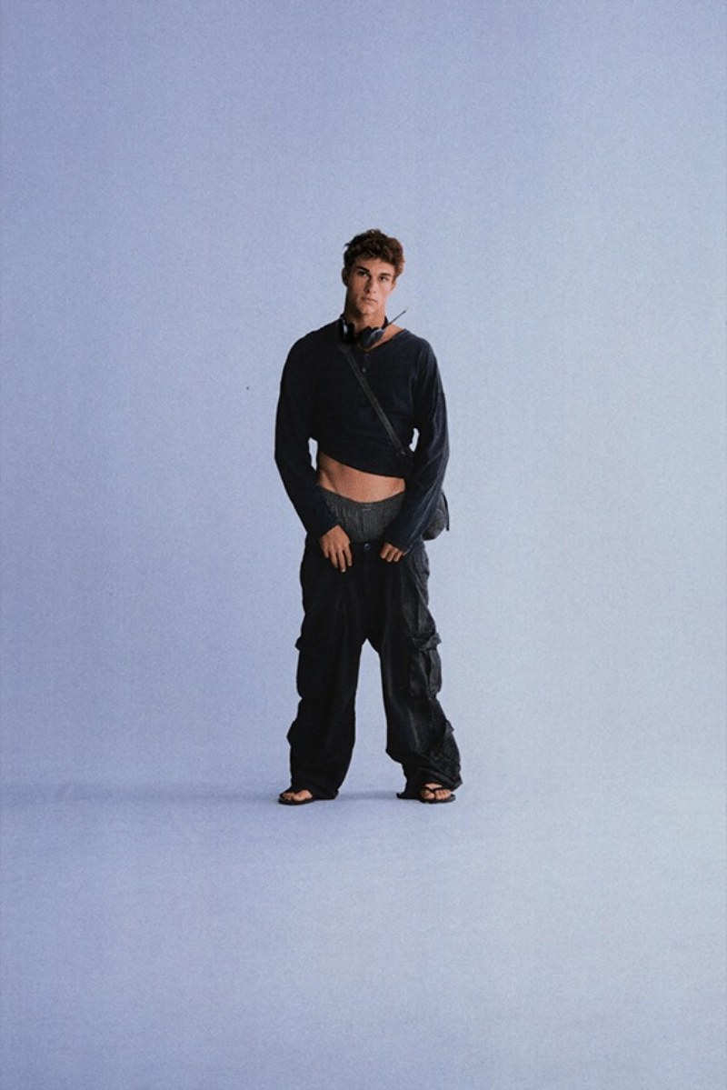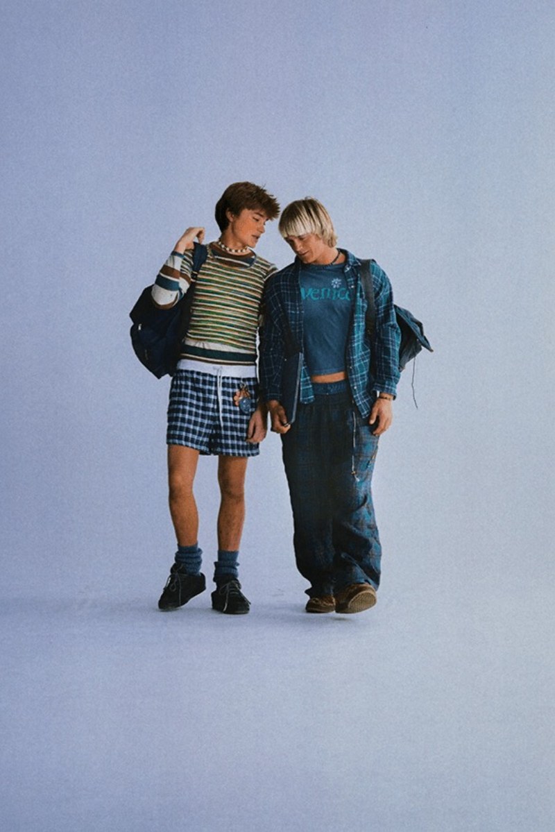 Aquí, cada una de esas pequeñas tribus tiene su momento de protagonismo. A esta mezcla tan particular y específica, se le suma el lenguaje clásico de ERL de siluetas relajadas puestas en contraste con prendas increíblemente ceñidas, desgaste, punto, denim y estampados check. ¿El resultado? Un armario de high street altamente curado que brilla por ser el revival de un periodo cultural perdido en el tiempo: el high school de los 2000 (con looks de vaqueros con chanclas incluidos).