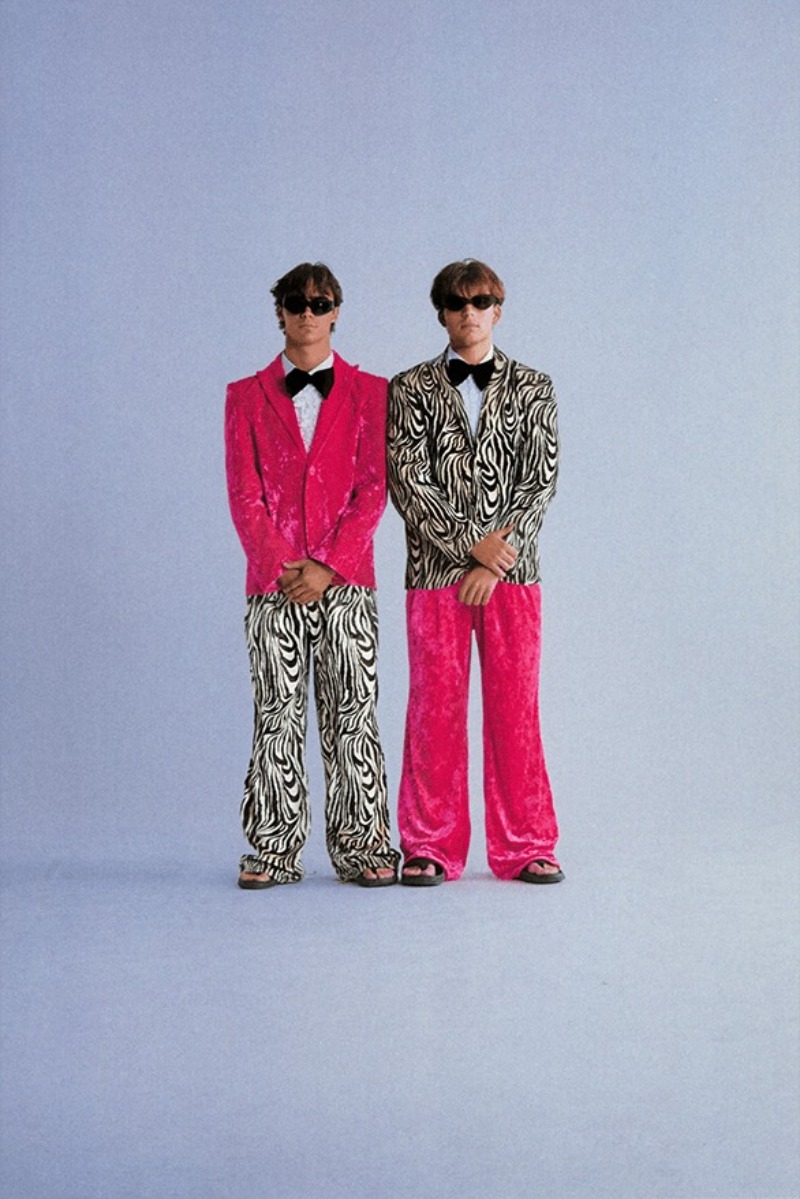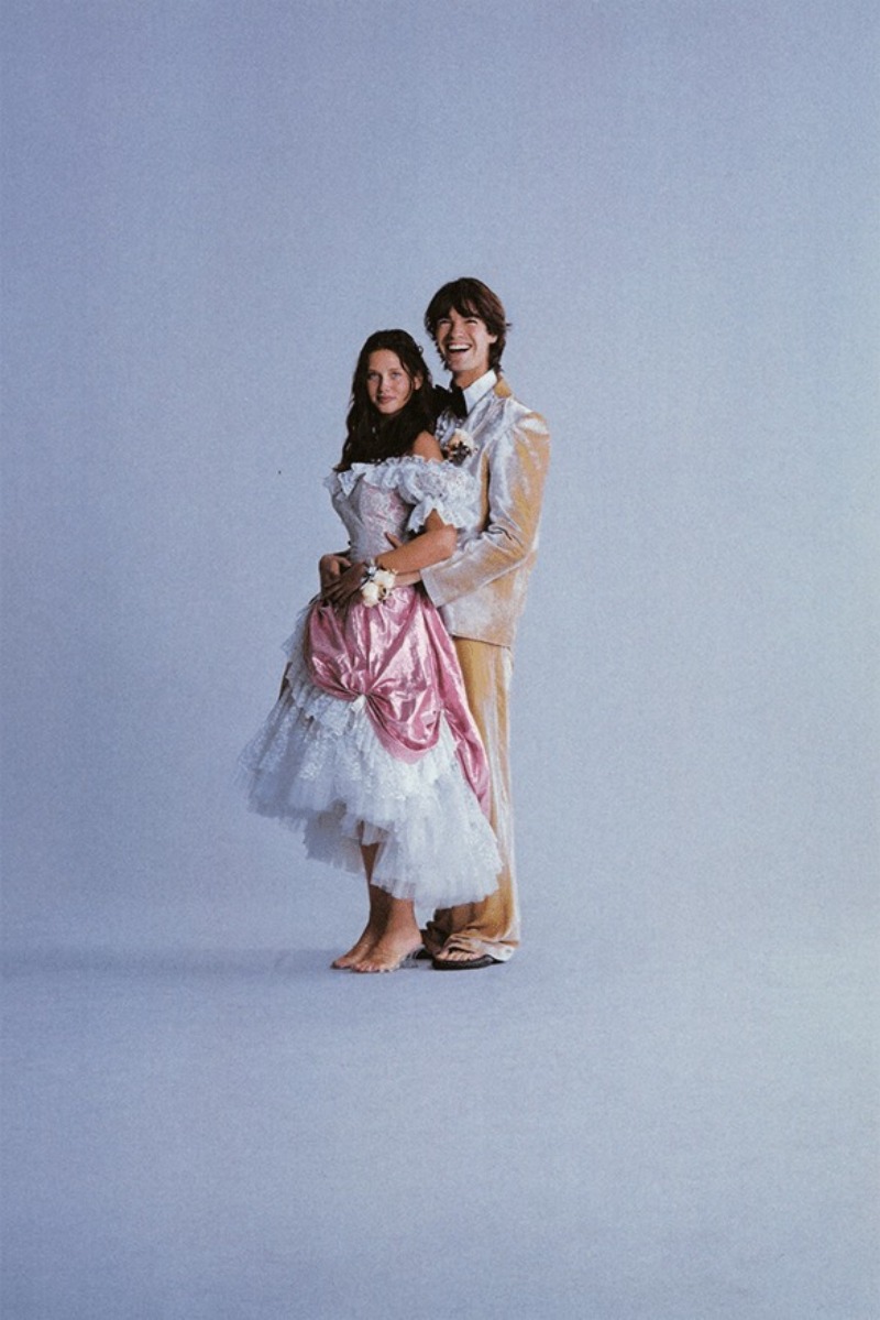 Y como todo acaba a lo grande, lo último que nos presenta ERL FW24 es un baile de senior prom. Aquí es donde vemos las prendas más “formales” de la propuesta: esmóquines de corte relajado en prints monocromáticos y fucsias chillones a juego con camisas de babero y pajaritas oversized. El conjunto de Prom King and Queen se compone de un vestido con volantes y encaje para mujer y un esmoquin de terciopelo color durazno para hombre. Luego vemos a la parejita vivir su “felices por siempre” con un conjunto de varsity de pelo y chinos blanco para él y un look de porrista para ella.