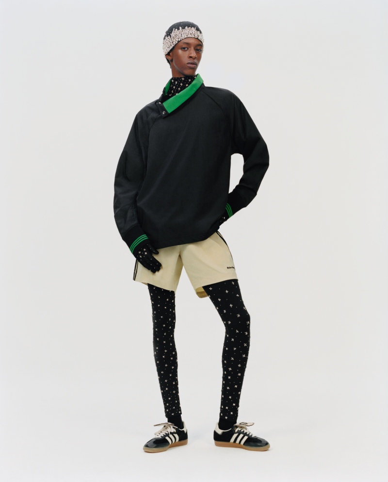 En el lado más de high street, nos encontramos con piezas reinterpretadas del armario clásico de la marca alemana. adidas Originals by Wales Bonner resalta una versión deconstruida de la chaqueta Harrington, ahora de corte asimétrico. Debajo, un conjunto de compresión decorado con pedrería en formato mini. También, nos encontramos con un polo de manga larga acanalado de aire setentero.