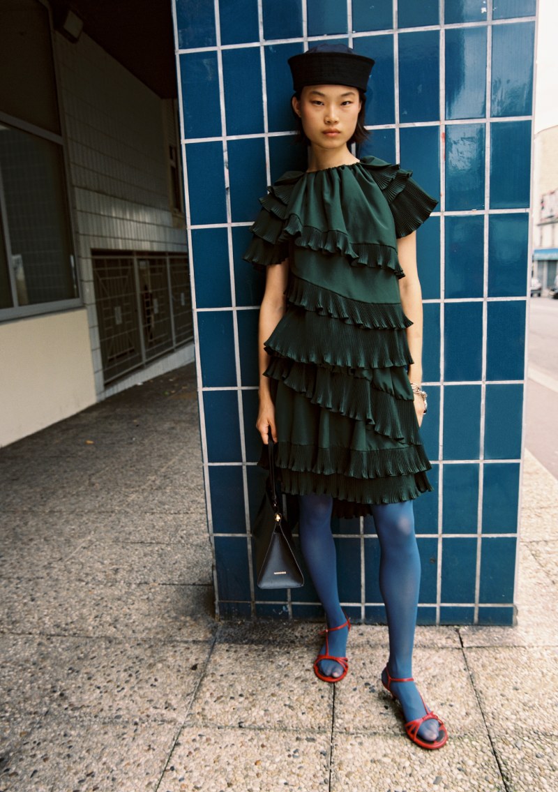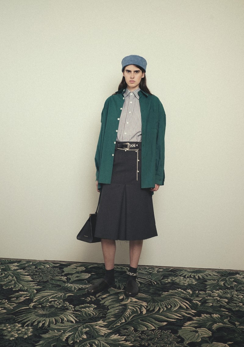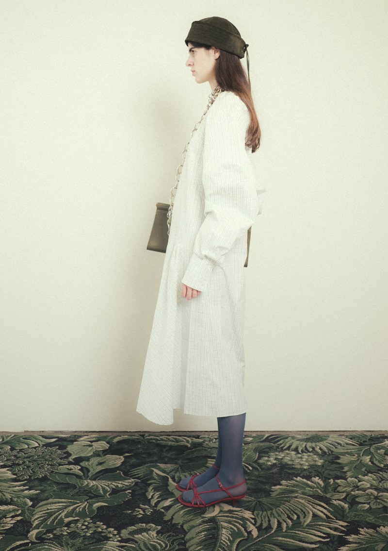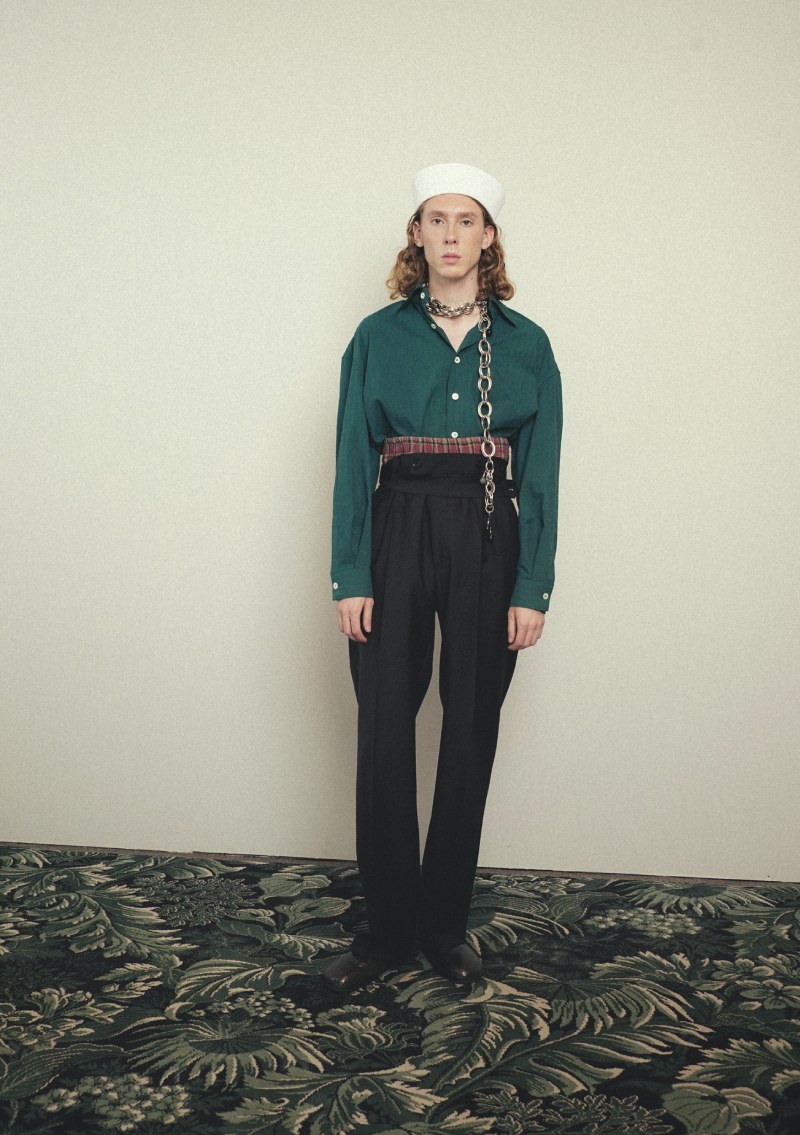 La camisa de botones prima en el terreno de las capas intermedias dentro de Namacheko ss26. Aquí, este staple puede servir para un look de fiesta en variantes satinadas y colores declarativos o como base de uniforme, como puede serlo cuando se deja blanca o a rayas clásicas. En esa misma área gris, los vestidos hacen lo mismo para el armario femenino. Aquí, vemos siluetas austeras y unicolores contrastar con creaciones más grandilocuentes; como el de mangas abullonadas y doble falda o el de volantes verde.