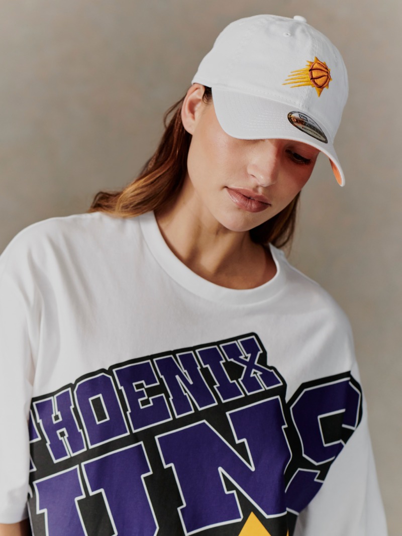 El color vuelve de New Era X NBA vuelve con el componente de los Phoenix Suns, con una gorra 9TWENTY blanca acentuada por su escudo amarillo y naranja y una camiseta oversize de igual inspiración nostálgica. La colección cierra con una gorra GOLFER con el logo de la NBA y un colorway rojo, blanco y azul súper retro que deja ver un ribete de cuerda sobre la visera.