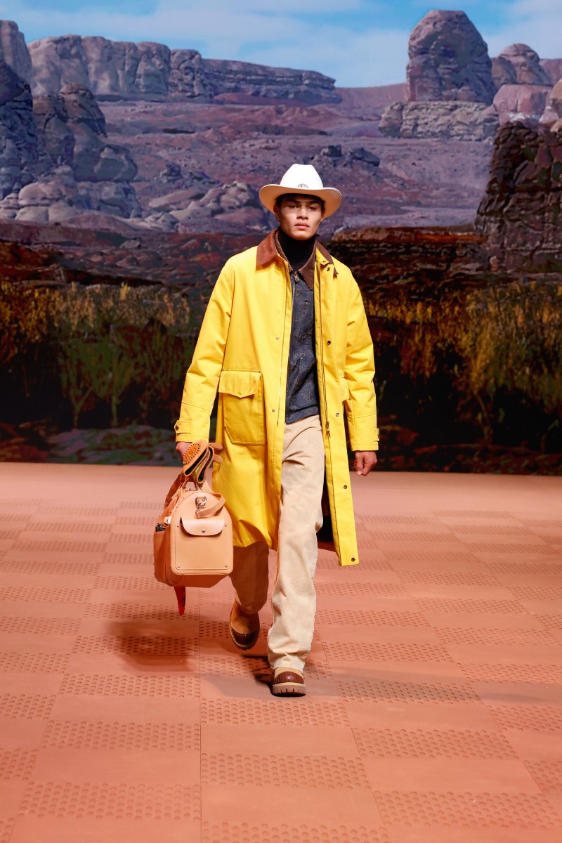 La colección hace un fuertísimo hincapié en la indumentaria de trabajo de campo, mostrando conjuntos de altísimo grado de utilidad. Pero al mismo tiempo, se deja espacio para el decoro. Aquí, la figura del dandy del Oeste se canaliza a través de conjuntos sartoriales cargados de adorno y decoro, dejando ver el máximo potencial de savoir-faire que alcanza Louis Vuitton. Aquí, vemos los cimientos del estilo americana alcanzar nuevos niveles a través de una actualización de silueta, corte y acabados (muchos de ellos hechos en colaboración con tribus norteamericanas).