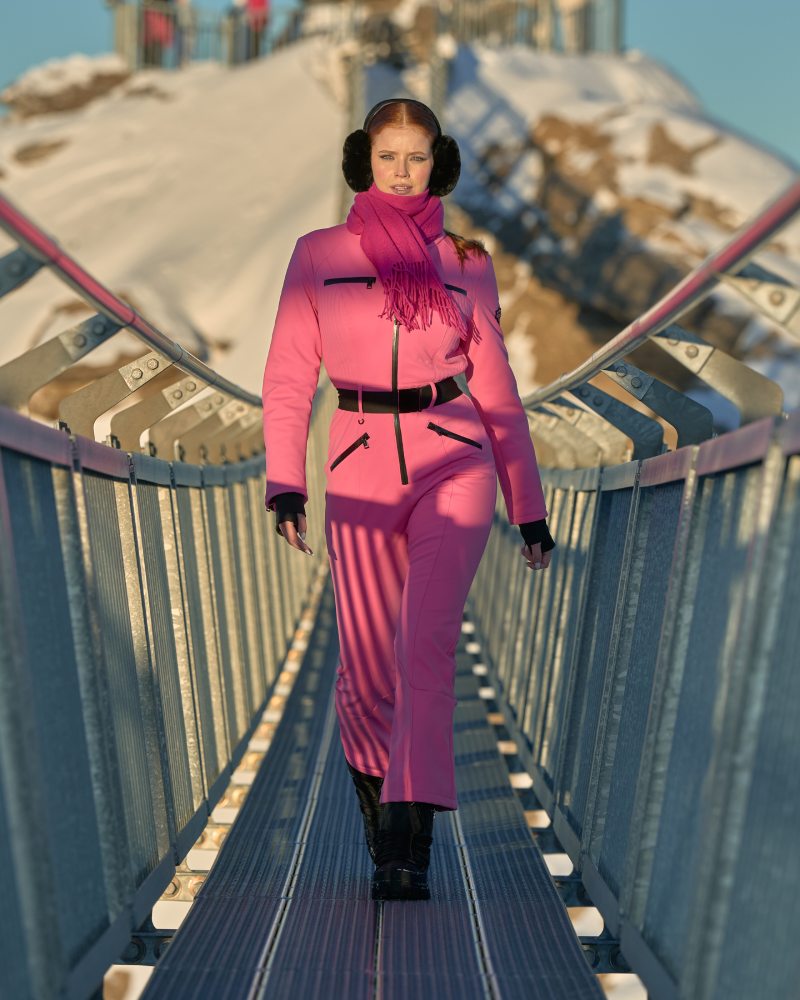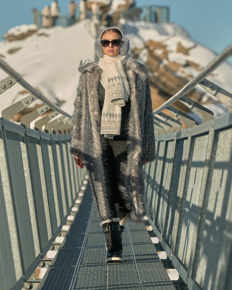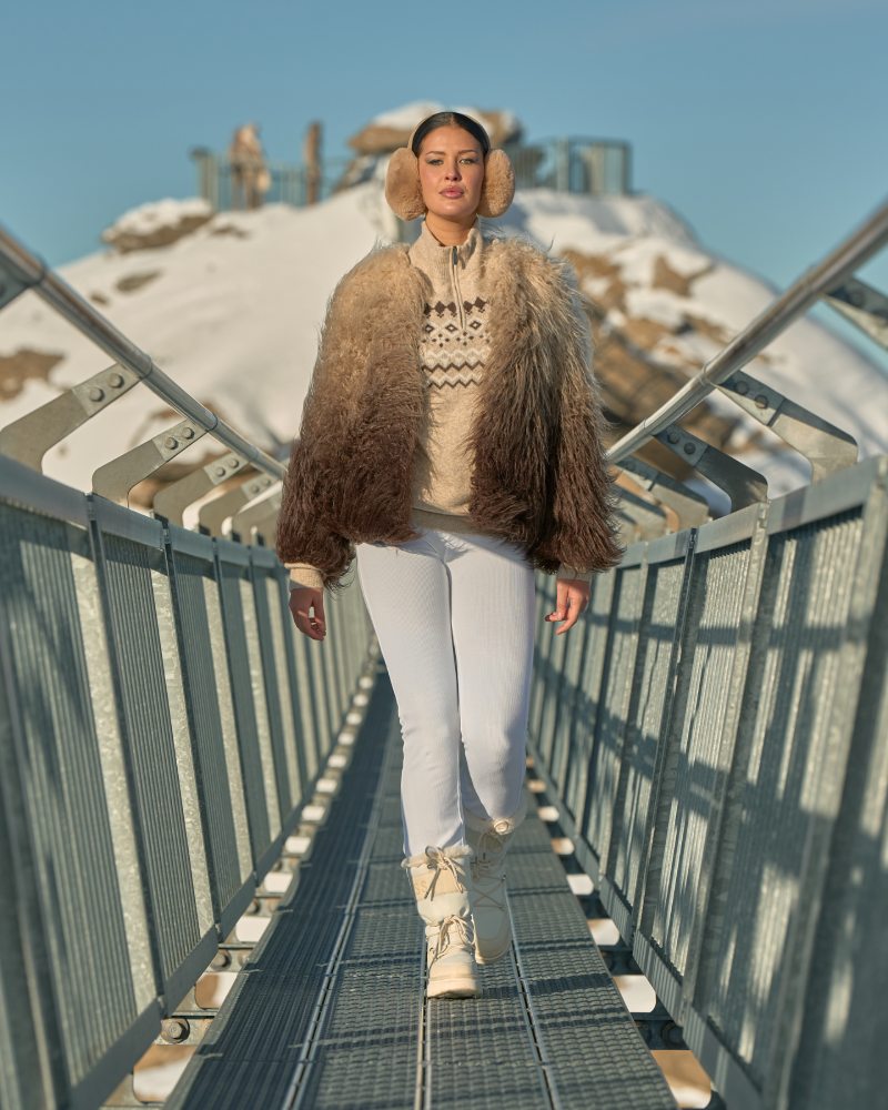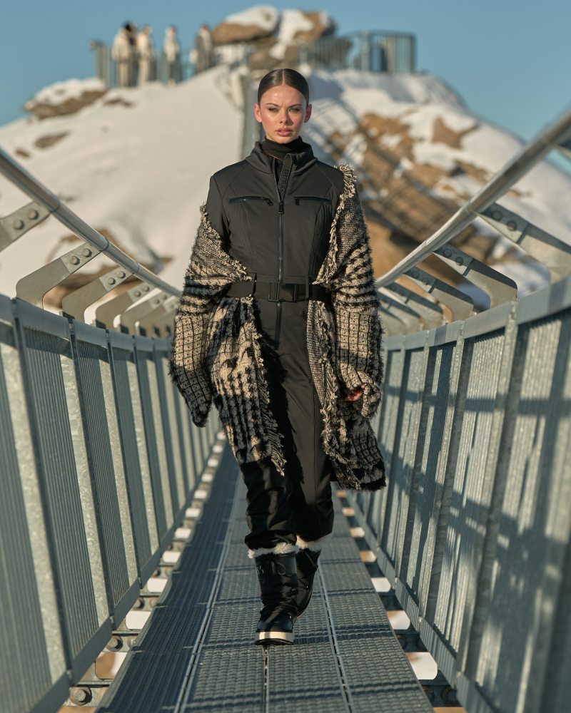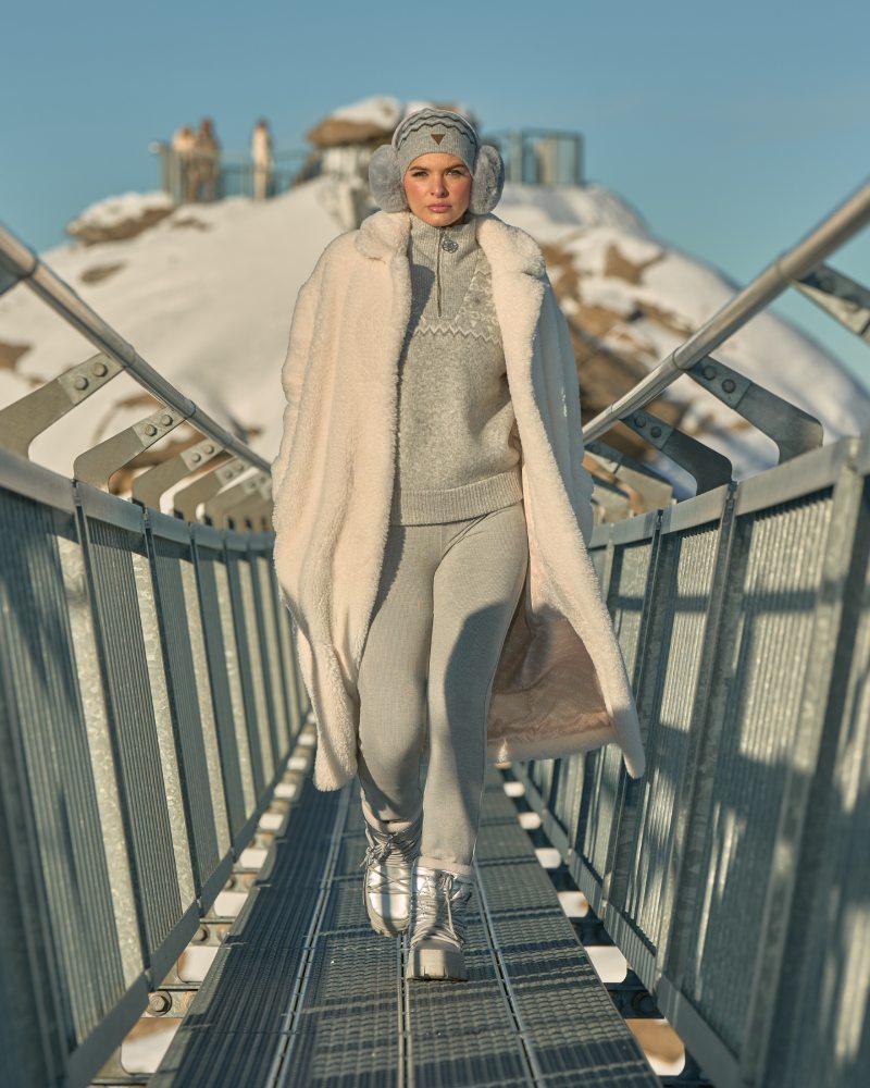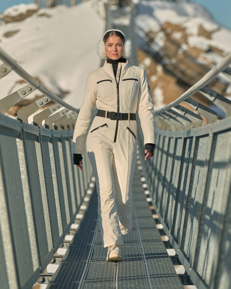 Y para celebrar este nuevo lanzamiento, Guess se va al origen de todo: los picos nevados. ¿Qué hicieron? Pues no solo mostraron la colección en un resort como un ambiente de après-ski, sino que subieron la montaña entera. El desfile fue en el Glacier 3.000, un puente suspendido entre montañas a 3.000 metros de altura y dio el backdrop perfecto para mostrar la colección.