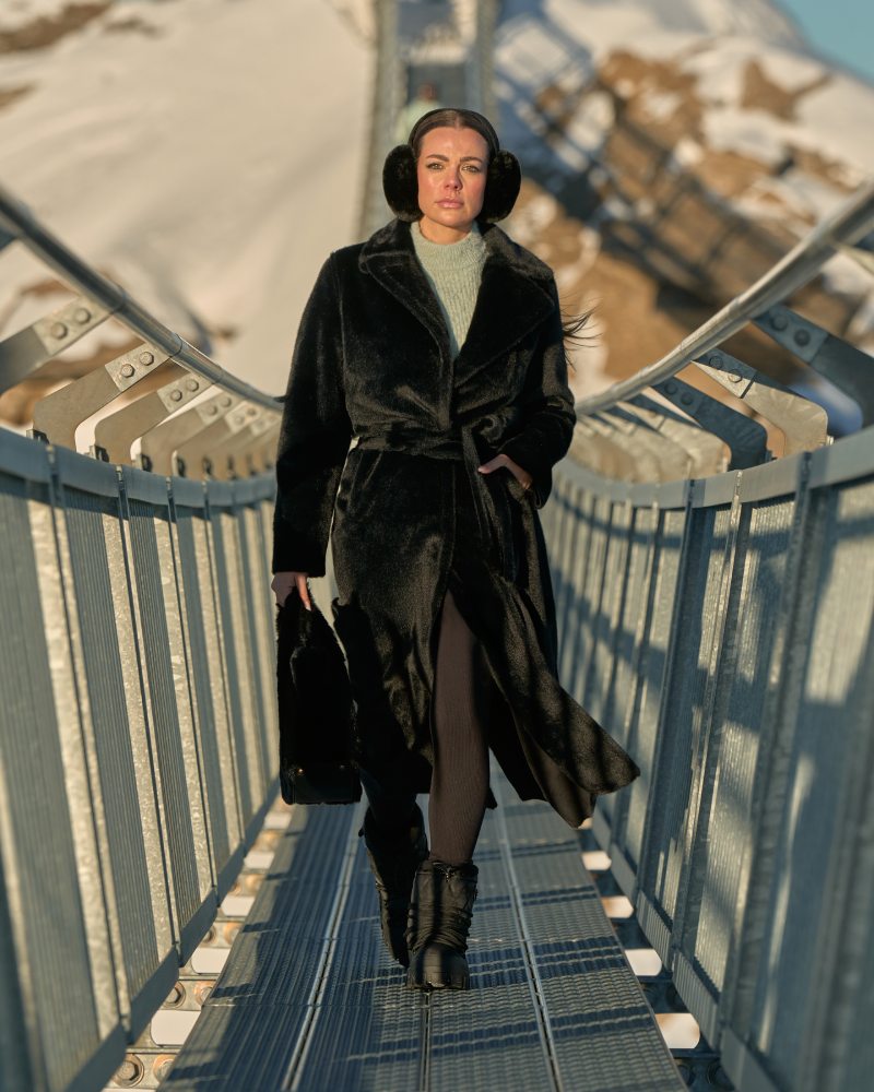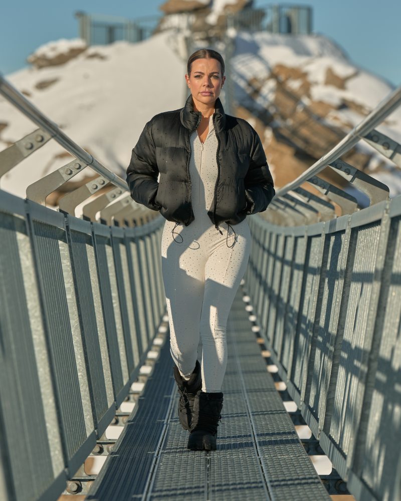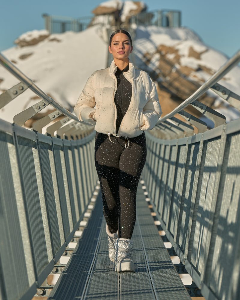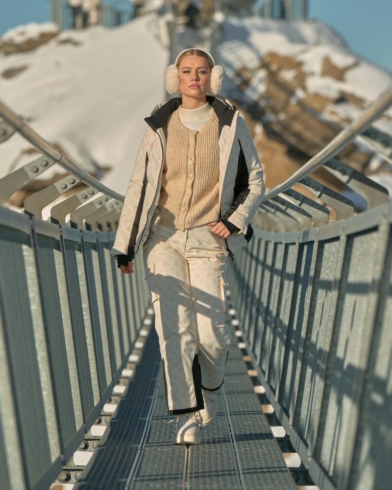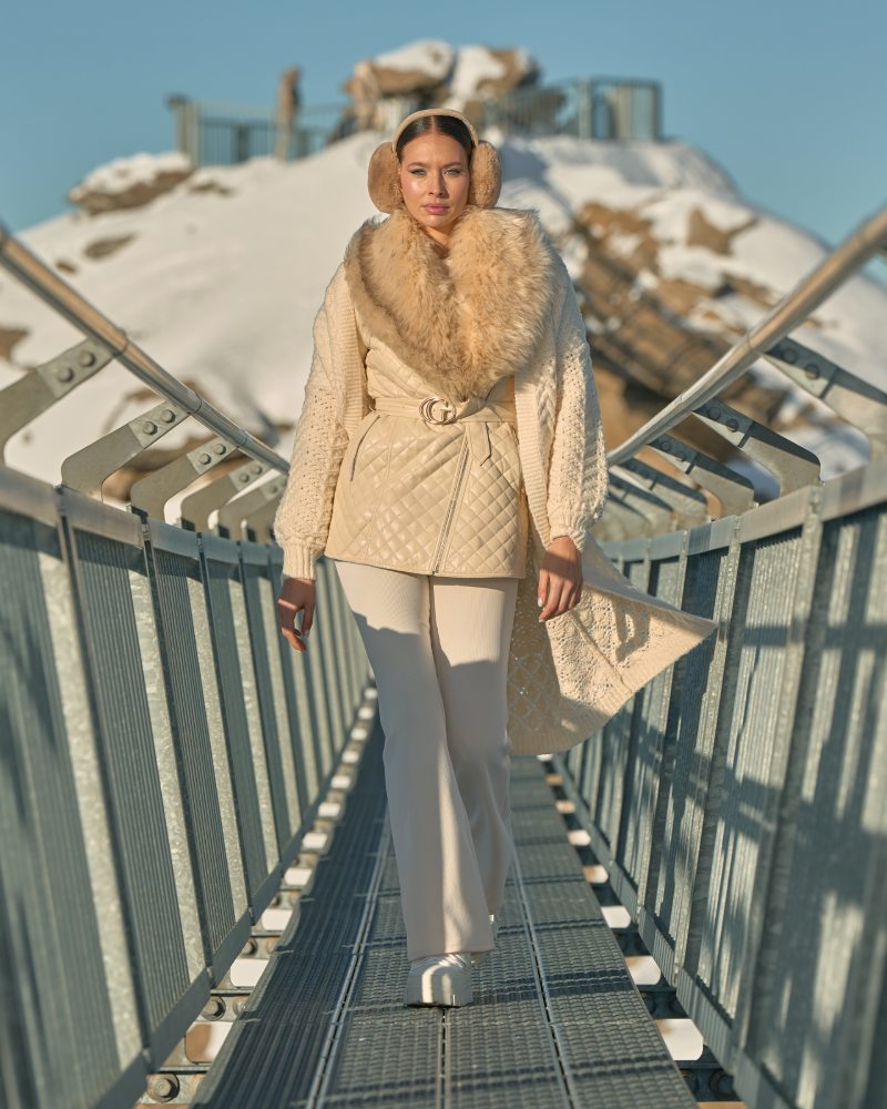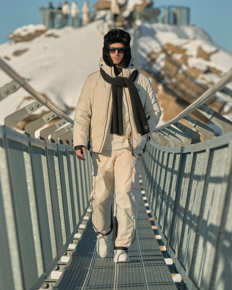 Y para celebrar este nuevo lanzamiento, Guess se va al origen de todo: los picos nevados. ¿Qué hicieron? Pues no solo mostraron la colección en un resort como un ambiente de après-ski, sino que subieron la montaña entera. El desfile fue en el Glacier 3.000, un puente suspendido entre montañas a 3.000 metros de altura y dio el backdrop perfecto para mostrar la colección.