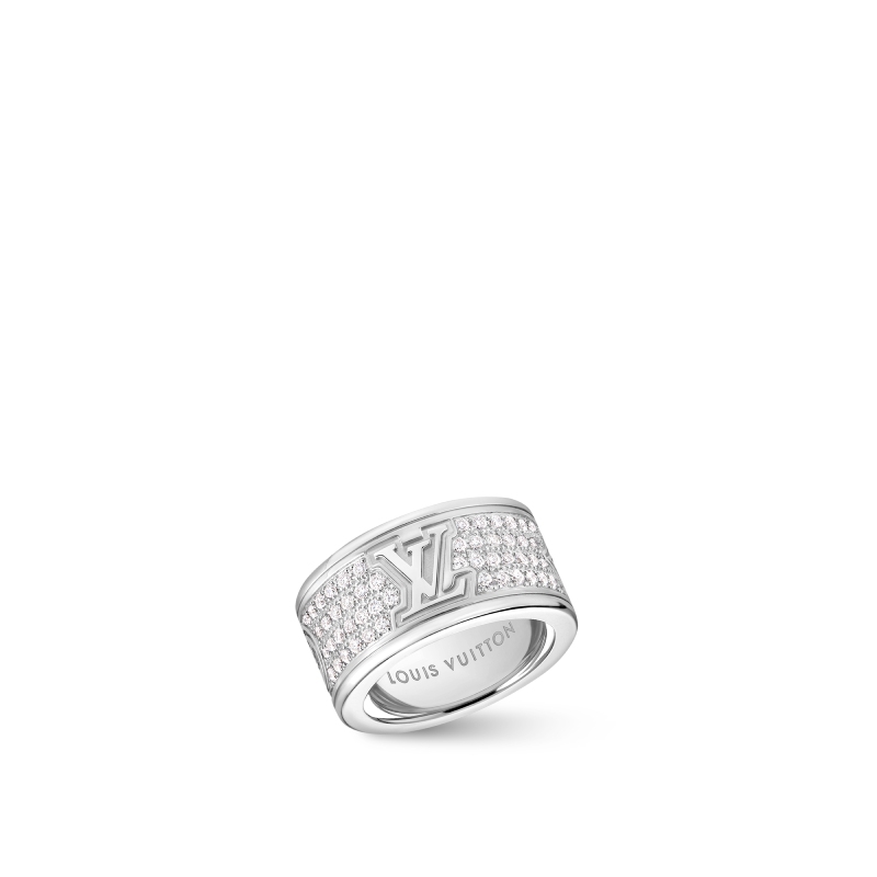 La colección Les Gastons se expande con otras piezas que beben del ideario de la maison. Aquí, la forma de los baúles se convierte en pendientes y charms de collares de oro blanco y diamantes. En la misma línea, tenemos anillos decorados con los motivos del LV Monogram. Los tags que vemos en collares y pendientes rescatan también estos motivos con un aire más minimalista.