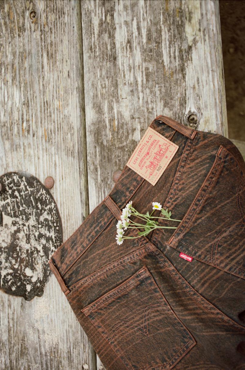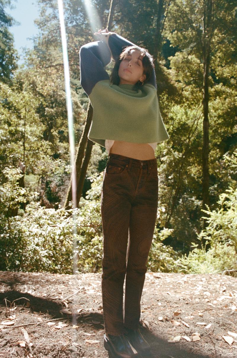 En las partes de abajo el protagonista es, como no podía ser de otra forma, un vaquero 501. El que firma Emma Chamberlain se ha teñido de marrón, y su patrón de fading se asemeja a los anillos de un árbol. Reforzando el aire vintage de la colección, tenemos también un pantalón naranja ocre de corte relajado y pierna afilada y una falda midi teñida en azul púrpura con acabado deshilachado en cintura y bajo.