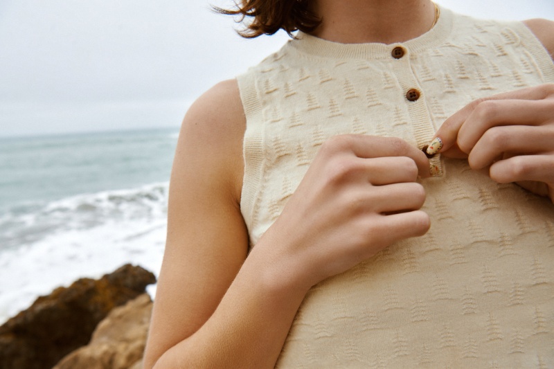 La colección continúa con un jersey de punto de corte relajado y cuello Mao. Las mangas, reimaginadas en formato de campana, sirven para elevar el clásico jersey de toda la vida a una prenda pensada más para un modelito tendencia. También tenemos un top sin mangas con ribbing en cuello y hombros en color crema, que de decora con un motivo tono sobre tono de pinos.