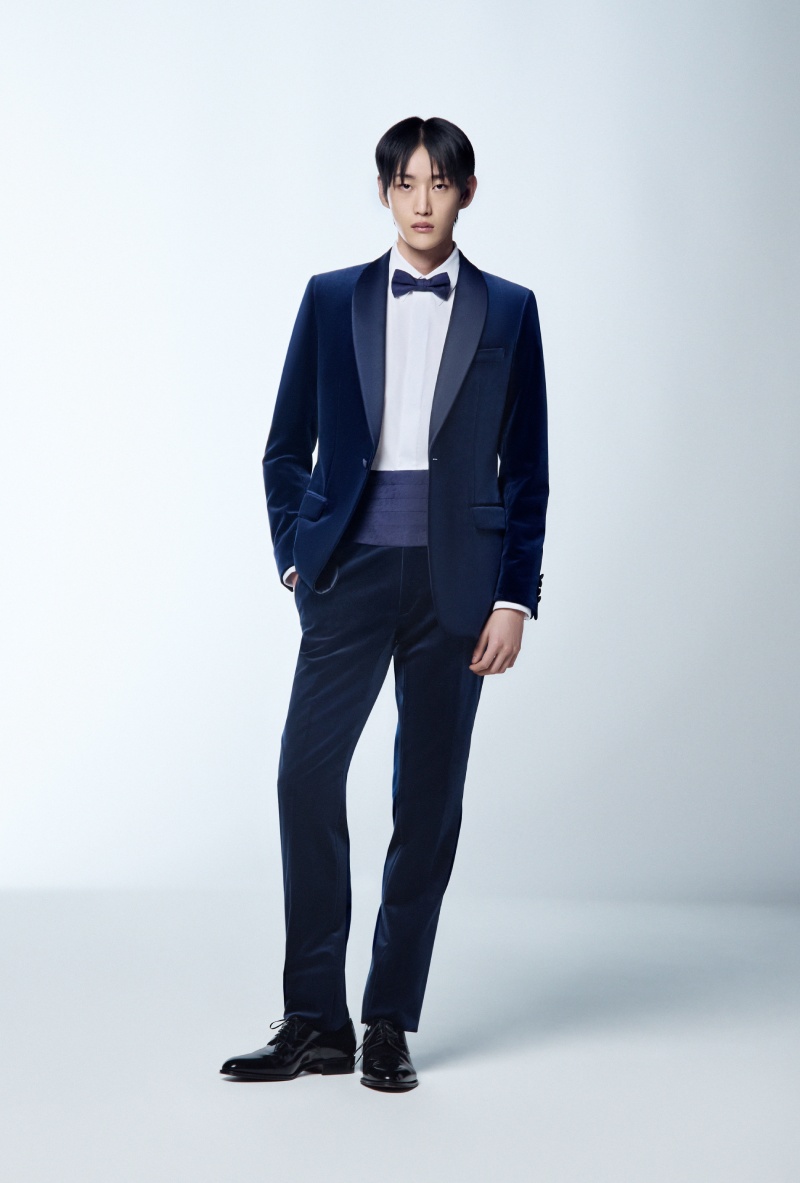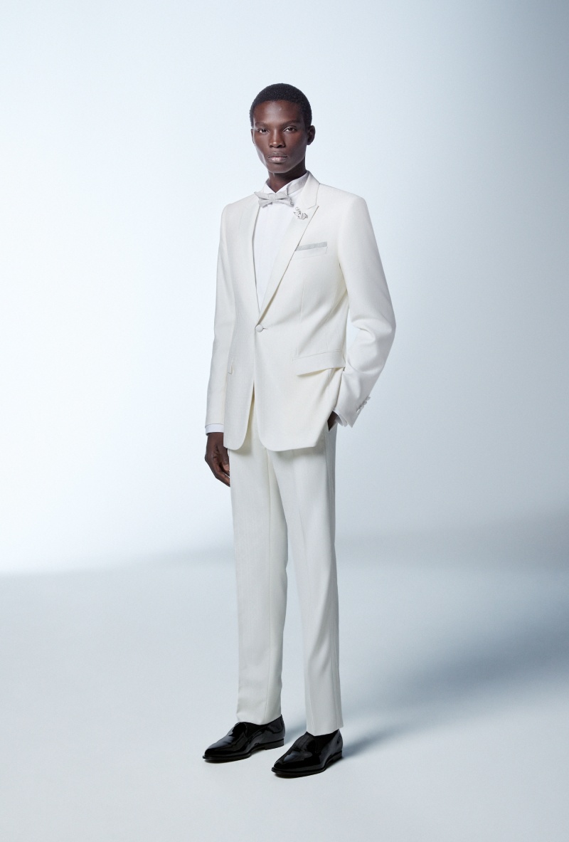 Pasando a lo más formal dentro de los nuevos looks de traje Dior, tenemos los esmóquines. El primero, para el día, presenta una chaqueta de solapas finas y hombros anchos a juego con pantalón de pinzas slim; todo en blanco, por supuesto. Y, para la noche, tenemos un esmoquin de cuello de chal en terciopelo azul profundo. Complementado de una faja de seda en el mismo tono.