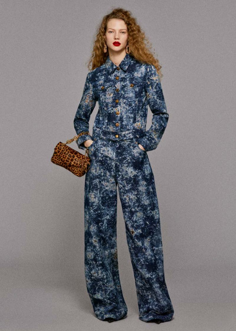 Roberto Cavalli Pre-fall 2025 sigue con jacquards florales sobre tonos neutro en esenciales de sastrería y eveningwear (ojo con el vestido cóctel a lo qipao). Luego, tenemos un poco más de flare italiano, con minivestidos, pantalones y blusas con temas barrocos en dorado y negro. También, hay una elevación del total look vaquero a través de velour azul y bordados abiertos más understated.