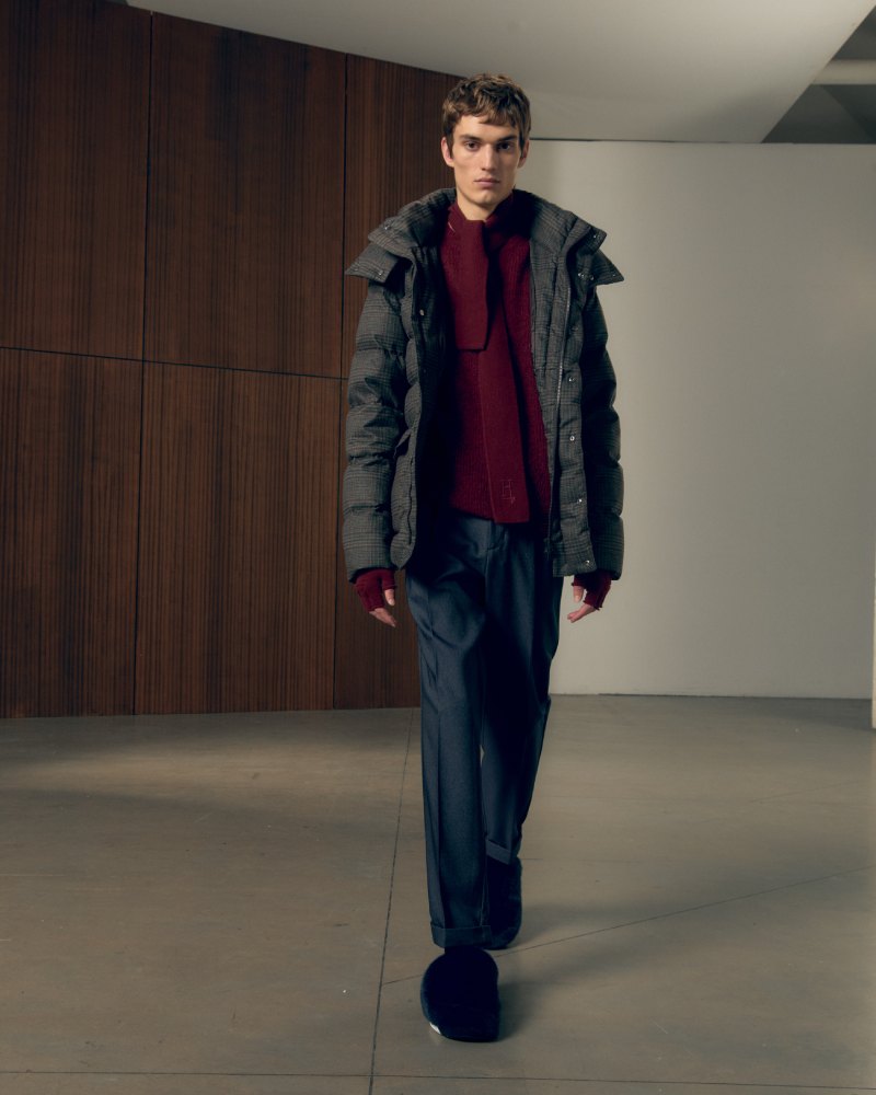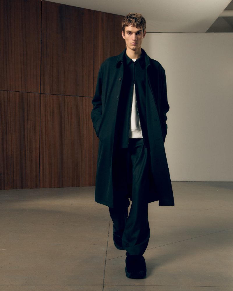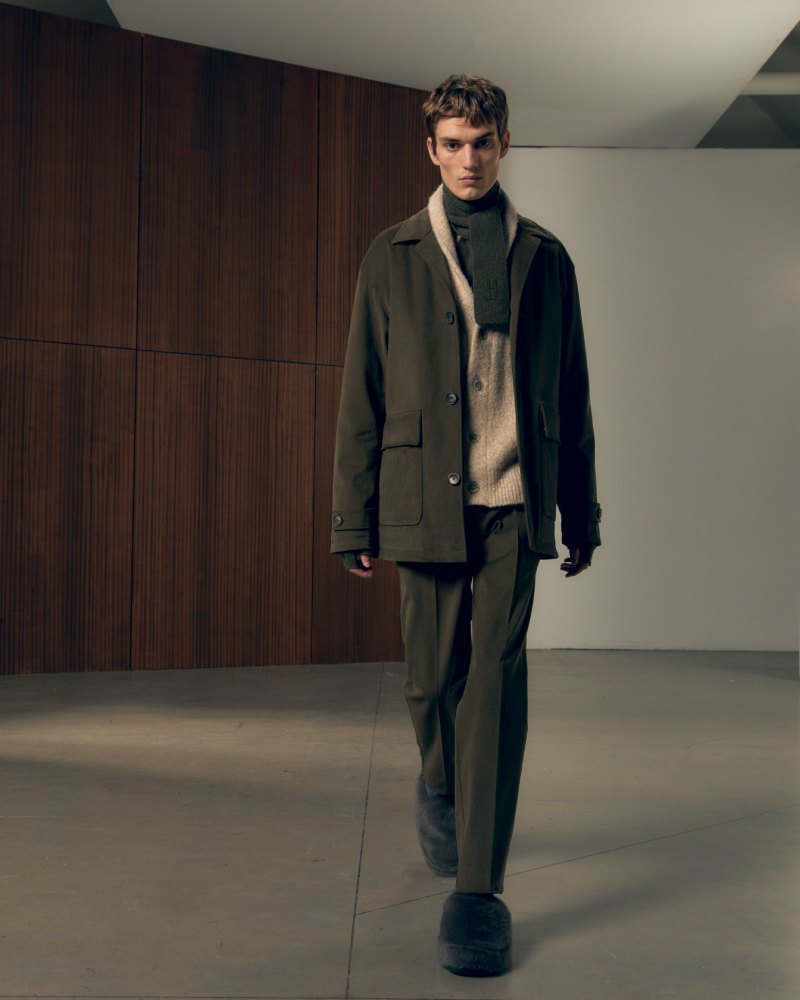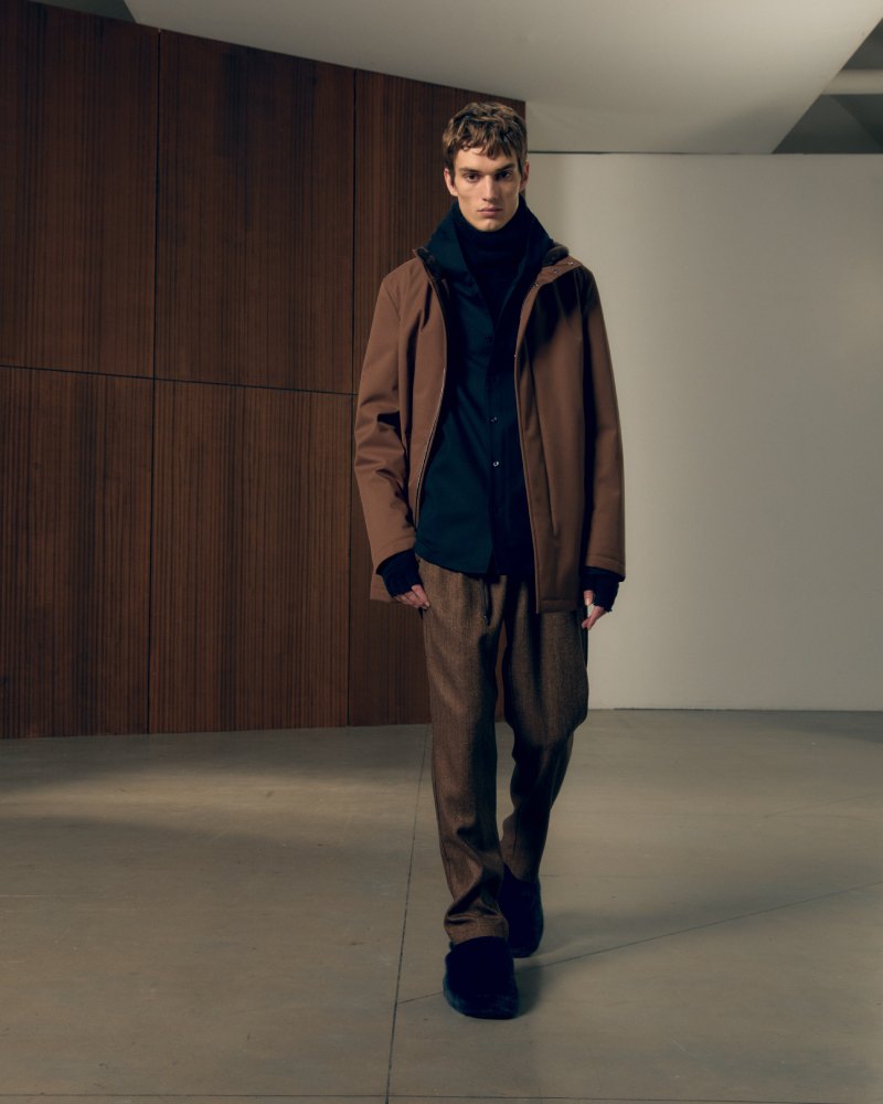 La colección de Herno Fw25 se divide en cuatro bloques y cada uno está pensado para una etapa distinta de la temporada Otoño-Invierno. Pero, en líneas generales, el estilo se mantiene bastante uniforme a medida que va evolucionando el armario. Como es obvio, el repertorio abre con sus piezas de outerwear. Aquí, encontramos abrigos de sastre en lana cruda y gabardinas tipo trench de cortes contemporáneos. Y, en una nota mucho más tech, tenemos cazadoras casuales (pero muy clásicas) de nylon acolchado y costuras ultra menswear.