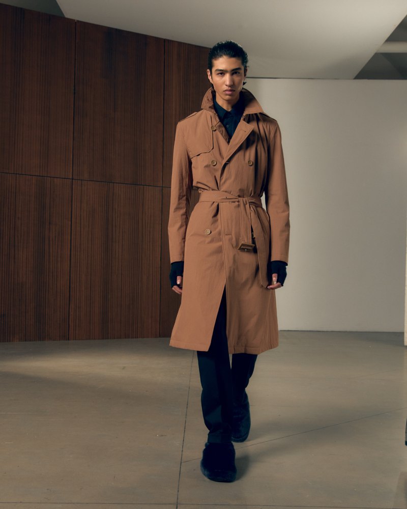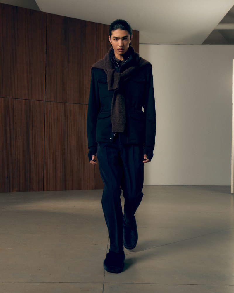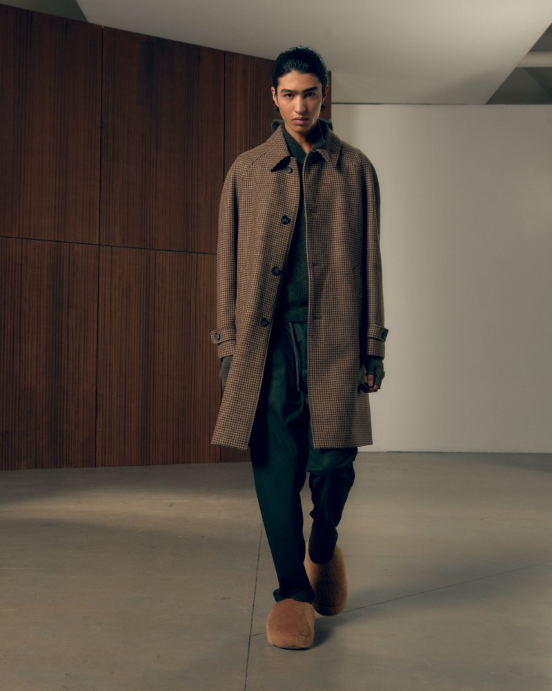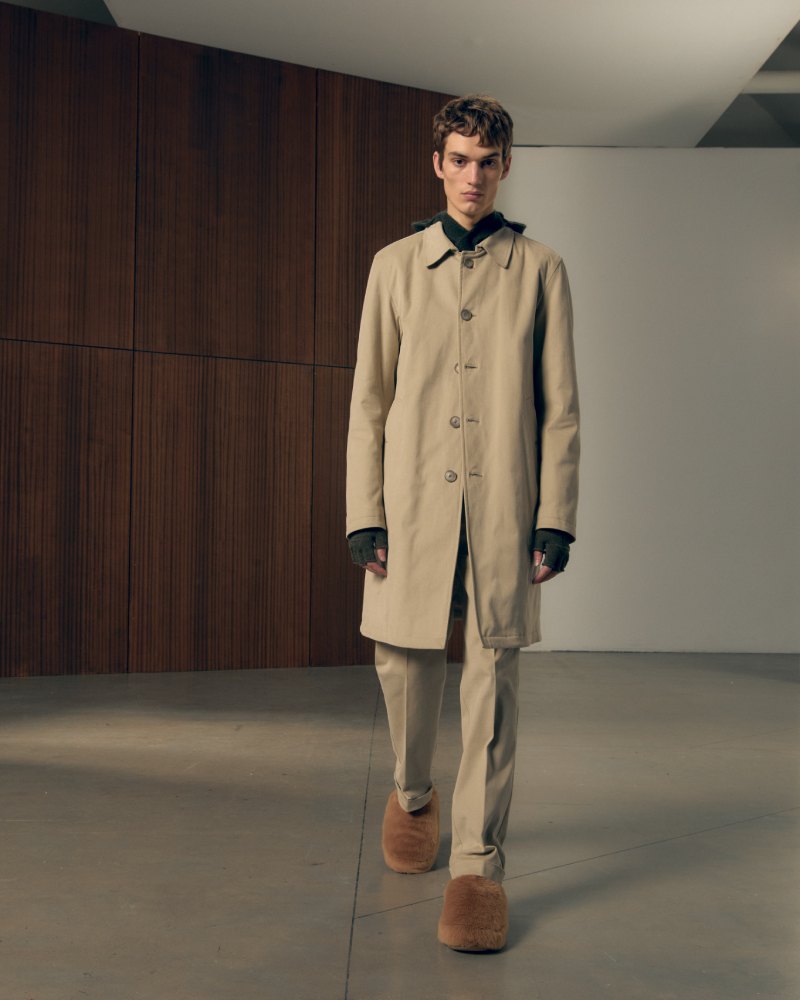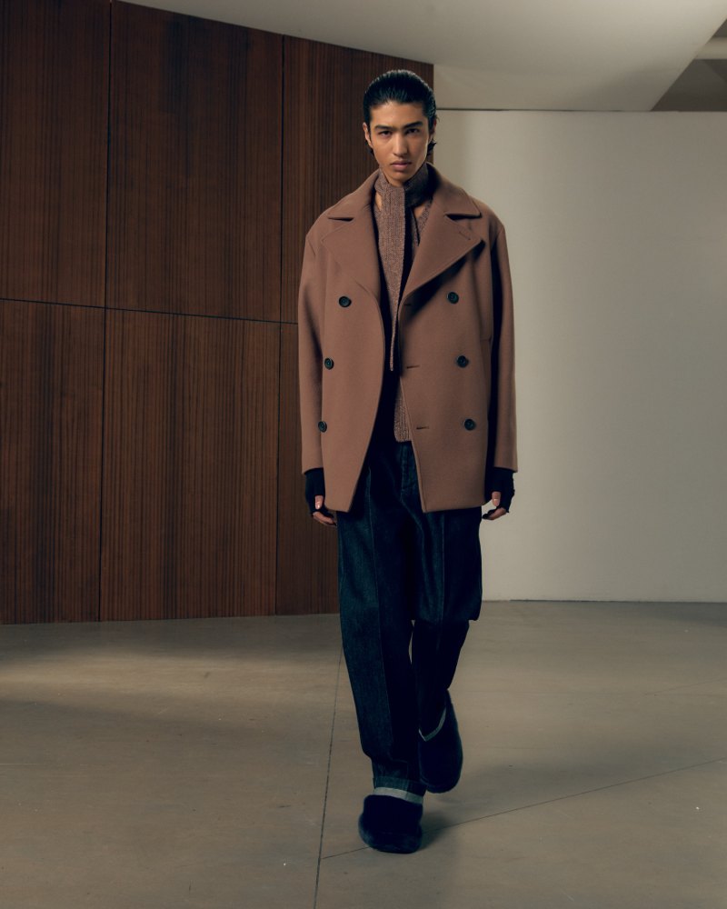 La colección de Herno Fw25 se divide en cuatro bloques y cada uno está pensado para una etapa distinta de la temporada Otoño-Invierno. Pero, en líneas generales, el estilo se mantiene bastante uniforme a medida que va evolucionando el armario. Como es obvio, el repertorio abre con sus piezas de outerwear. Aquí, encontramos abrigos de sastre en lana cruda y gabardinas tipo trench de cortes contemporáneos. Y, en una nota mucho más tech, tenemos cazadoras casuales (pero muy clásicas) de nylon acolchado y costuras ultra menswear.