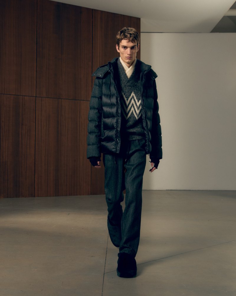 En cuanto a capas intermedias, Herno Fw25 apuesta bastante por el total look con conjuntos de cazadoras de inspiración workwear y pantalones de corte recto en materiales mucho más elevados. Incluso, tenemos un traje de falso denim bastante interesante. Las prendas de punto también ayudan a la composición de estos looks: los de esta colección son ceñidos, unicolores y riquísimos en textura.