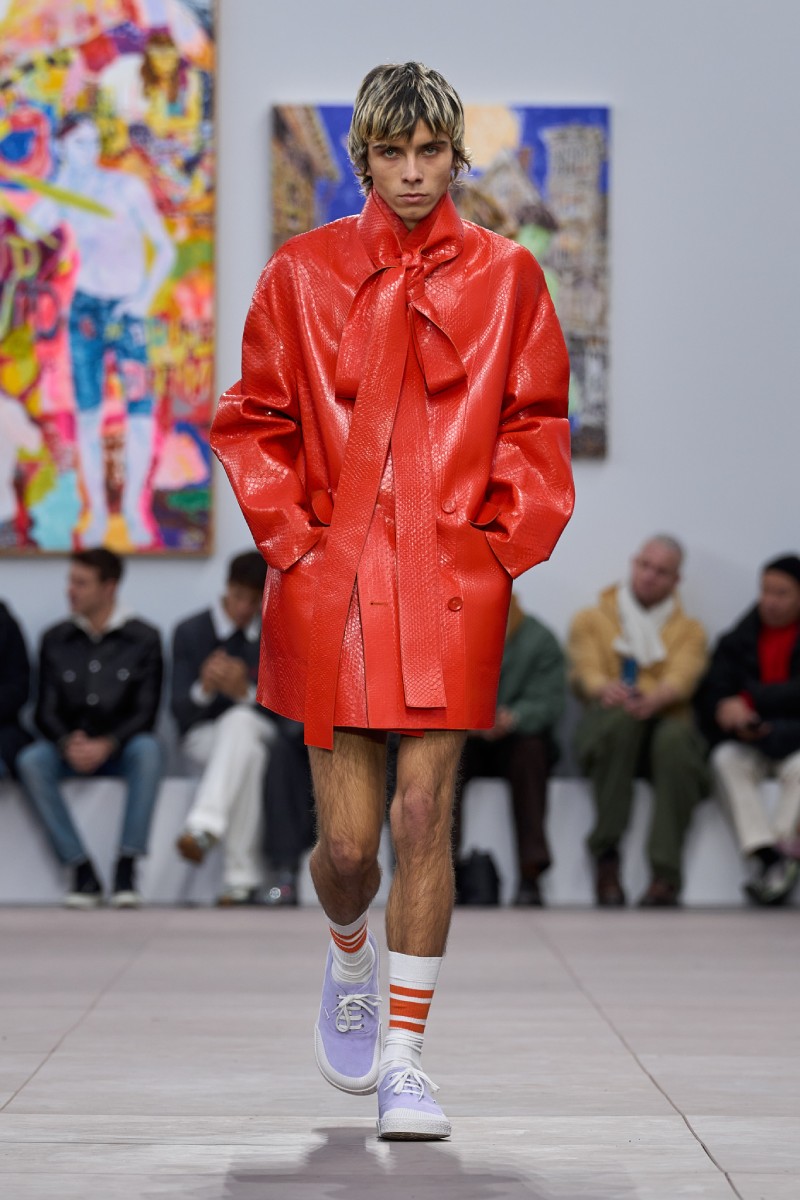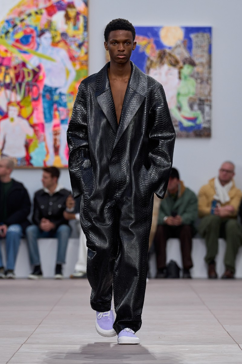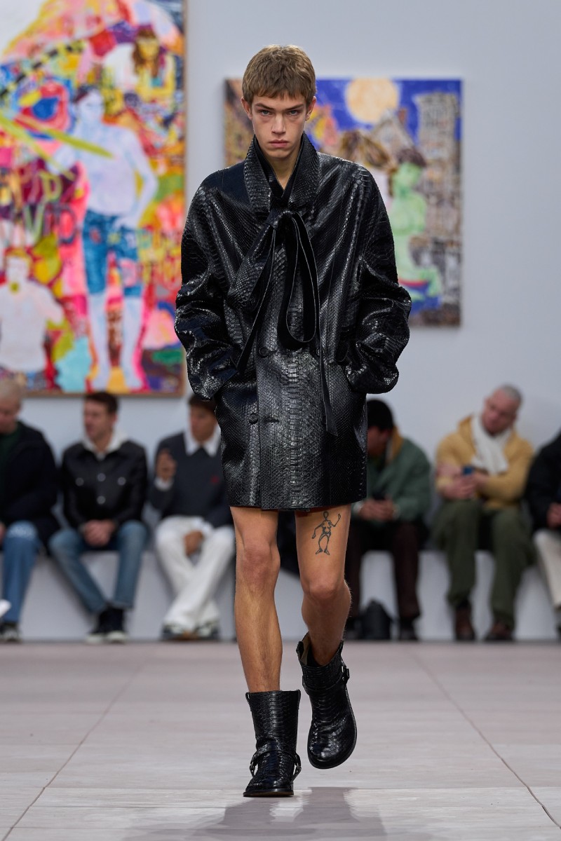 Loewe Hombre FW24 abre con las piezas fundamentales del nuevo armario masculino, reimaginadas para el hombre moderno. Dos abrigos cruzados de corte relajado abrieron el desfile y marcaron el tono de todo lo que seguía. Estas prendas, construidas en piel de serpiente de colores saturados, se decoraban con lazos al cuello exagerados. La camisa de botones, el pantalón de cuero y el chándal siguieron esta procesión con versiones reimaginadas y muchísimo más contemporáneas.