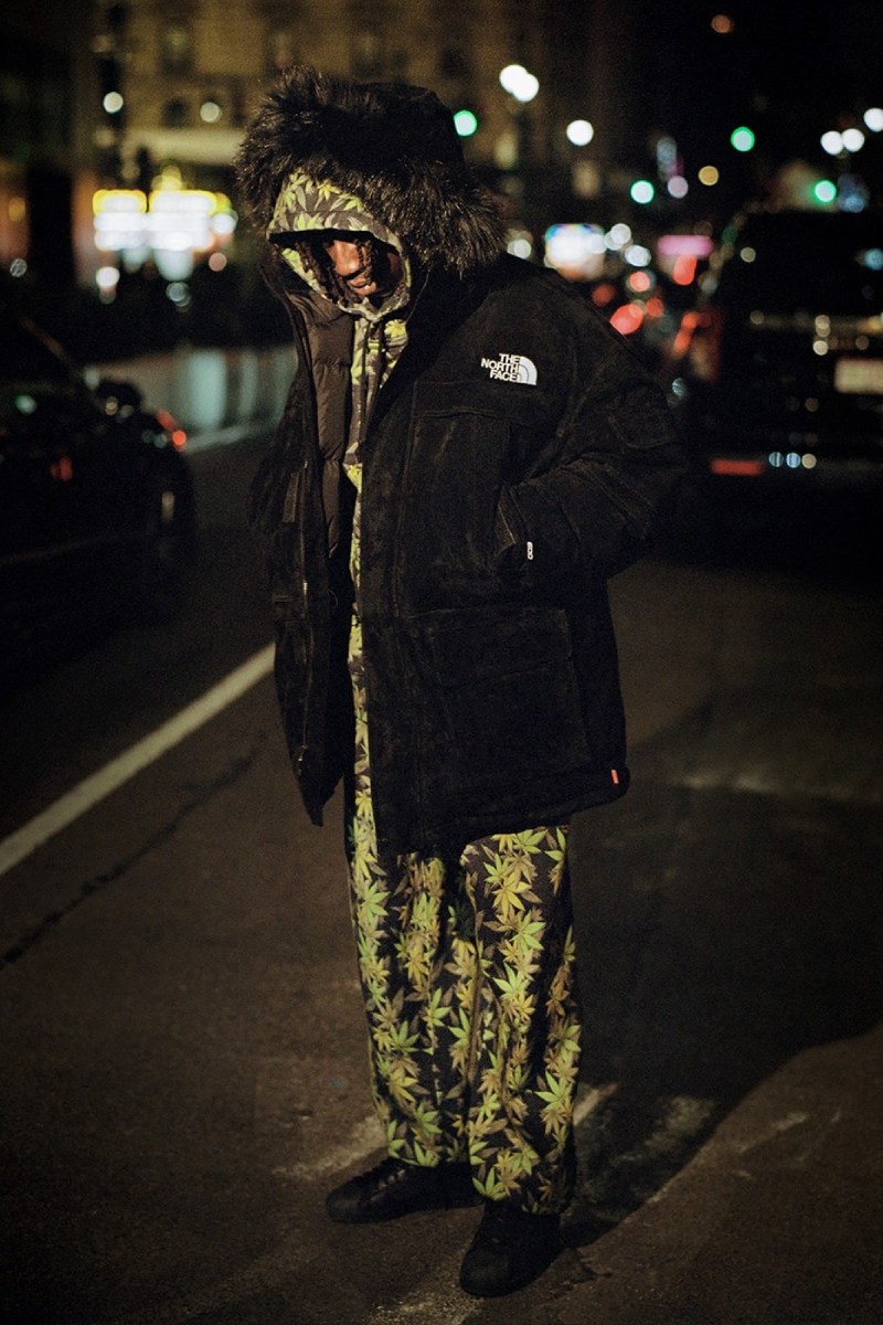 Siguiendo la línea de construcción elevada de las piezas de outerwear, Supreme X The North Face FW23 propone un pantalón de montaña para completar el total look. Con un corte ligeramente baggy esta versión se corona como una pieza tan estética como funcional, gracias a sus seguros bolsillos y cintura elástica. El mismo parche colaborativo decora la pieza, por si seguís con la fiebre del box logo. Pero no todo queda en cosas de ante, la colección también propone conjuntos de chándal estampado y camisetas gráficas para usarse como capas intermedias. Para esta temporada, estos básicos se decoran con un estampado de hojas de cannabis en versiones con fondo blanco o negro.