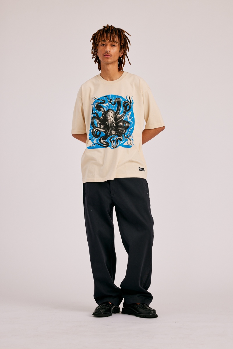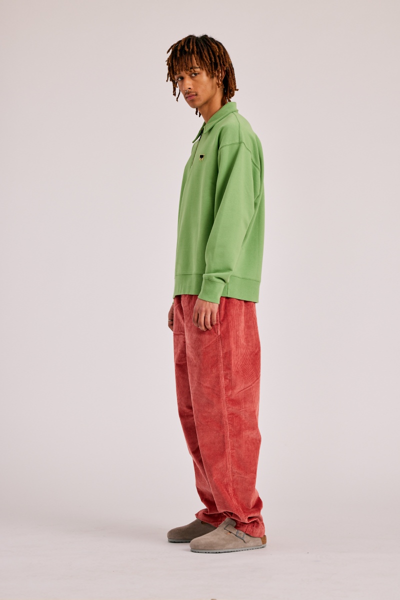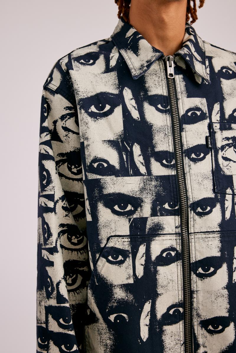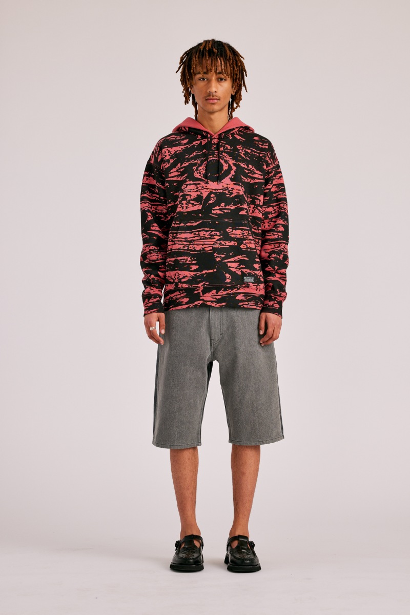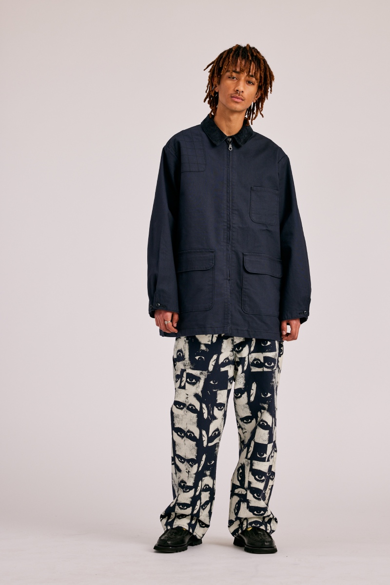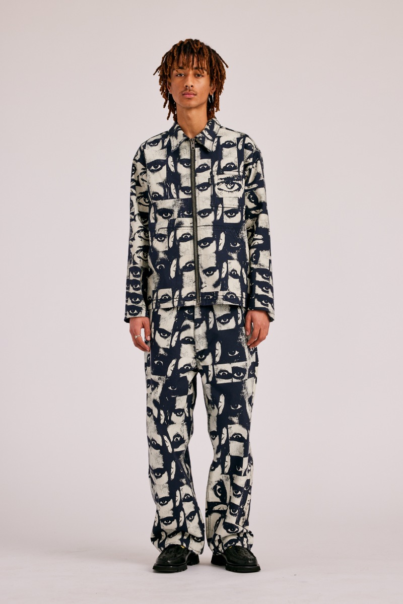 Complementando este nuevo armario tendencia, tenemos pantalones estilo carpenter y chino como alternativas más elevadas. Pero si de verdad queréis canalizar la nostalgia noventera, la colección ofrece vaqueros baggy y super baggy para vuestros looks urbanos. Como punto de dramatismo, nos encontramos con un atuendo coordinado que se decora con un estampado de ojos firmado por Roemello.