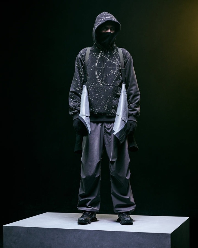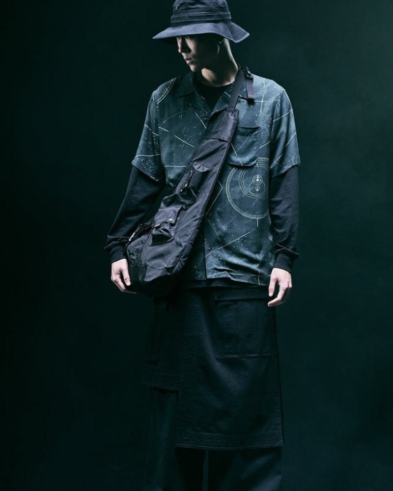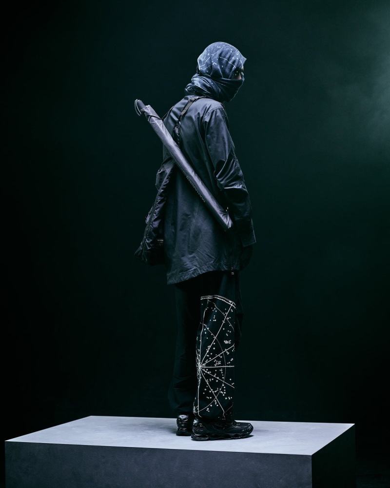La pieza más especial de la cápsula de Maharishi X Everything is Recorded es un híbrido de kimono y bomber de corte oversize construido en nylon verde militar. A parte de ser un mix bastante interesante de culturas, esta prenda se acentúa con un bordado hecho a mano de una cobra súper statement. Siguiendo con otros highlights de exteriores, tenemos cazadoras técnicas y desmontables estampadas con un diseño de constelaciones.
