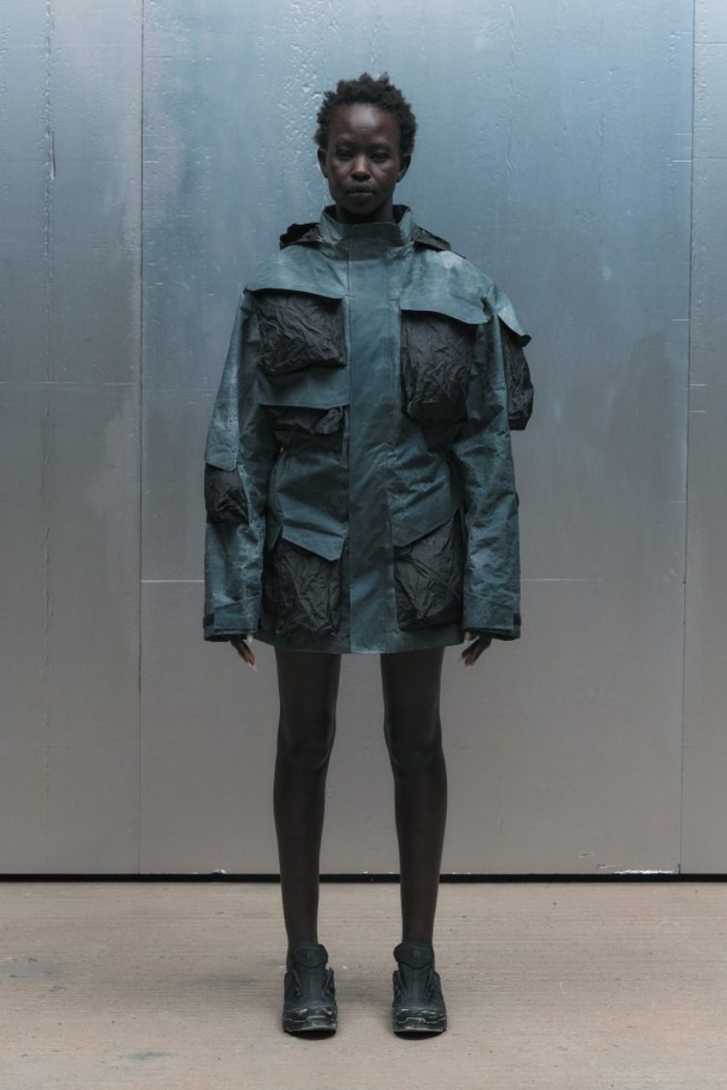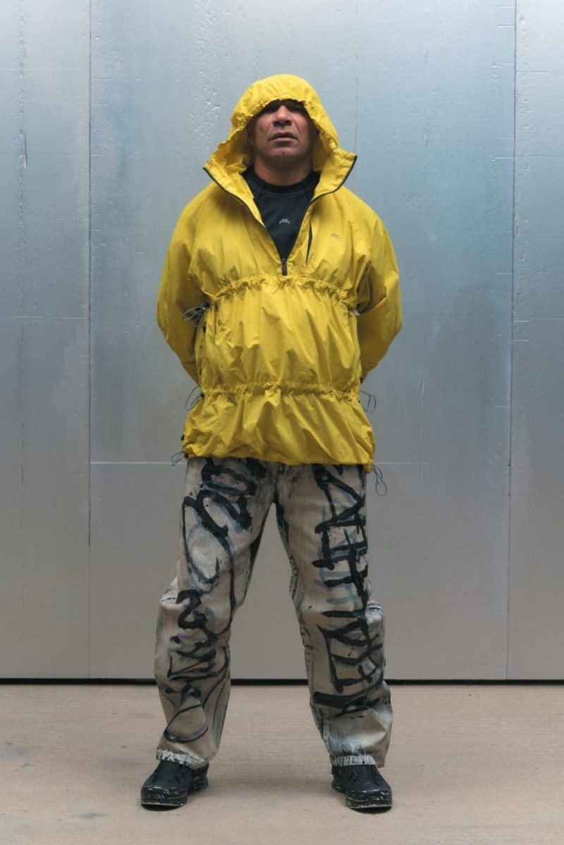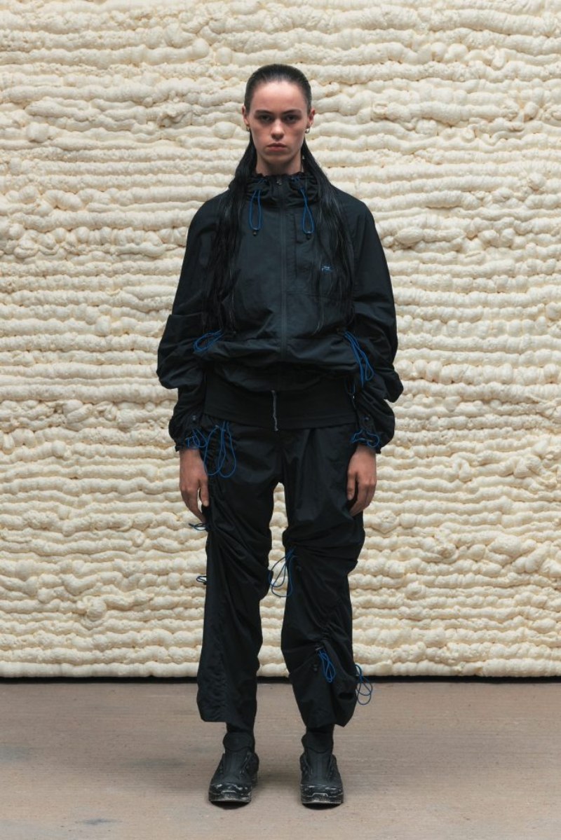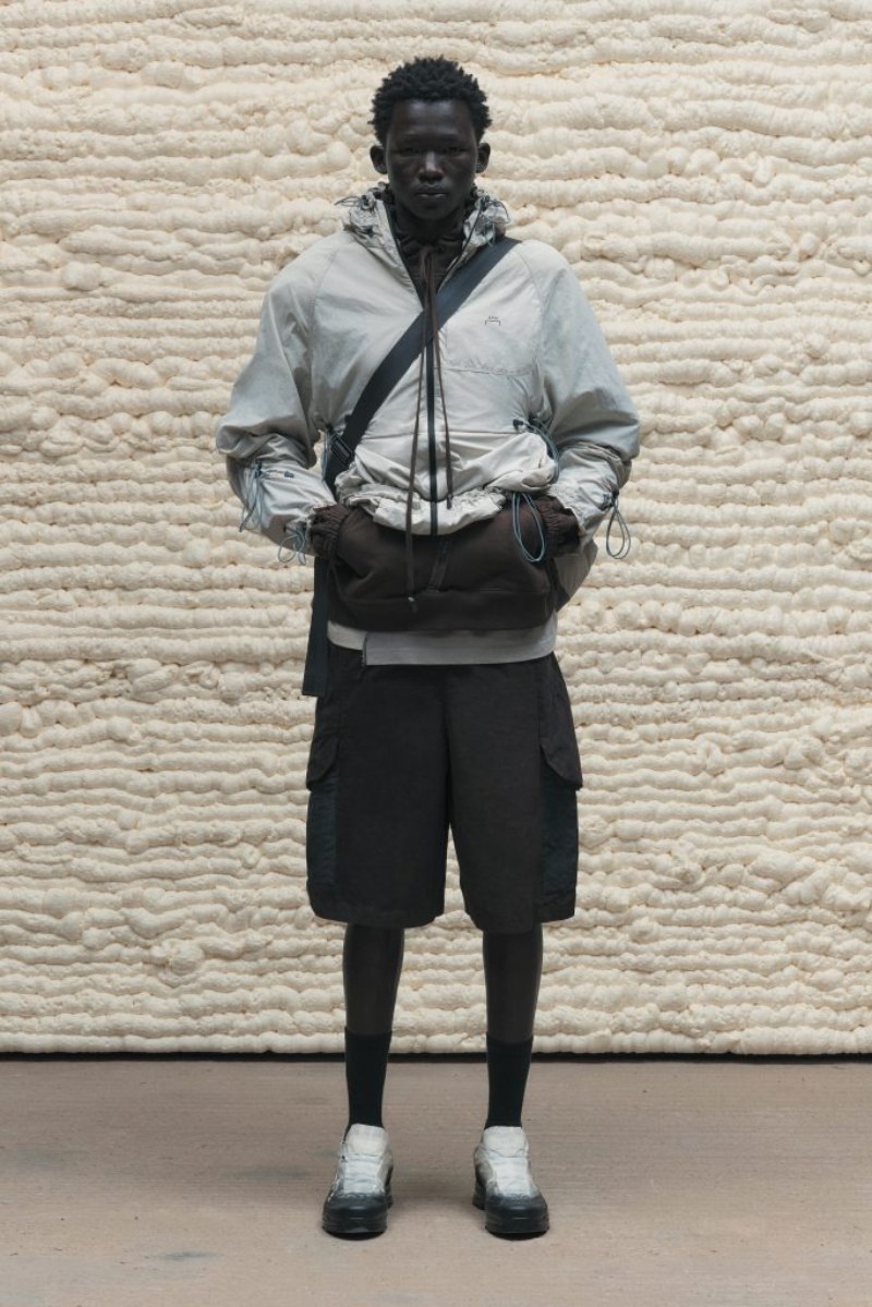 El nuevo armario high street de A-Cold-Wall* SS25 abre con prendas de background deportivo configuradas para lo elevado. Conjuntos técnicos en nylon o chándal de cortavientos (o hoodies) se radicalizan con un corte oversize y capucha. Como punto de exageración, cinchas y frunces acentúan estas piezas para crear nuevos volúmenes y dimensiones. También tenemos una cazadora M-65 de inspiración militar, subvertida con un corte oversize y construcción asimétrica, a juego con acabado desgastado y derelicto.