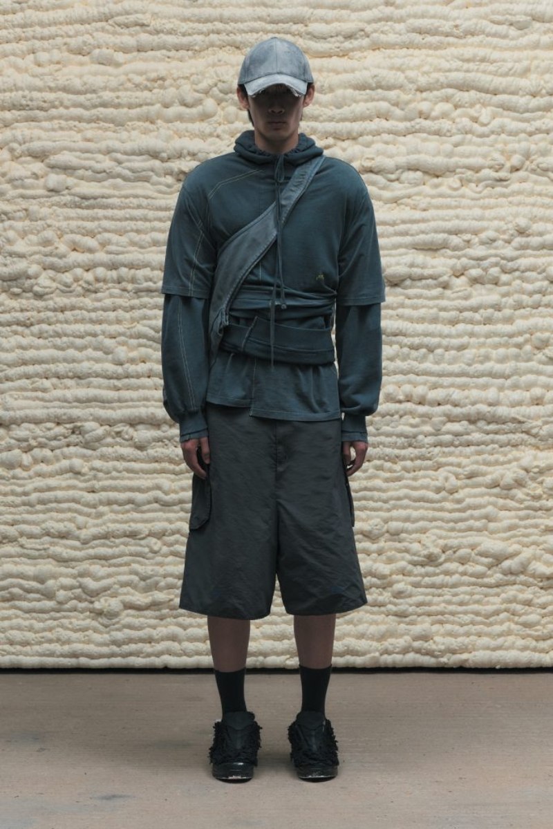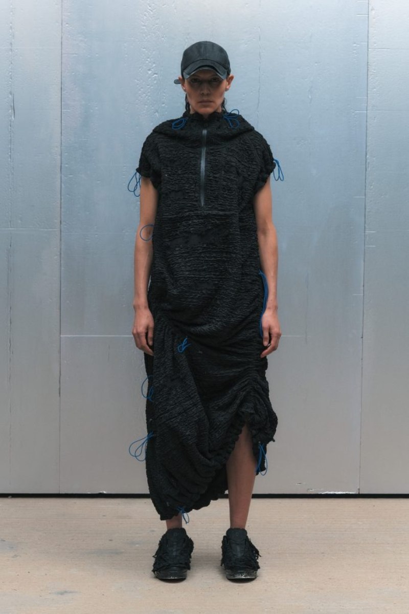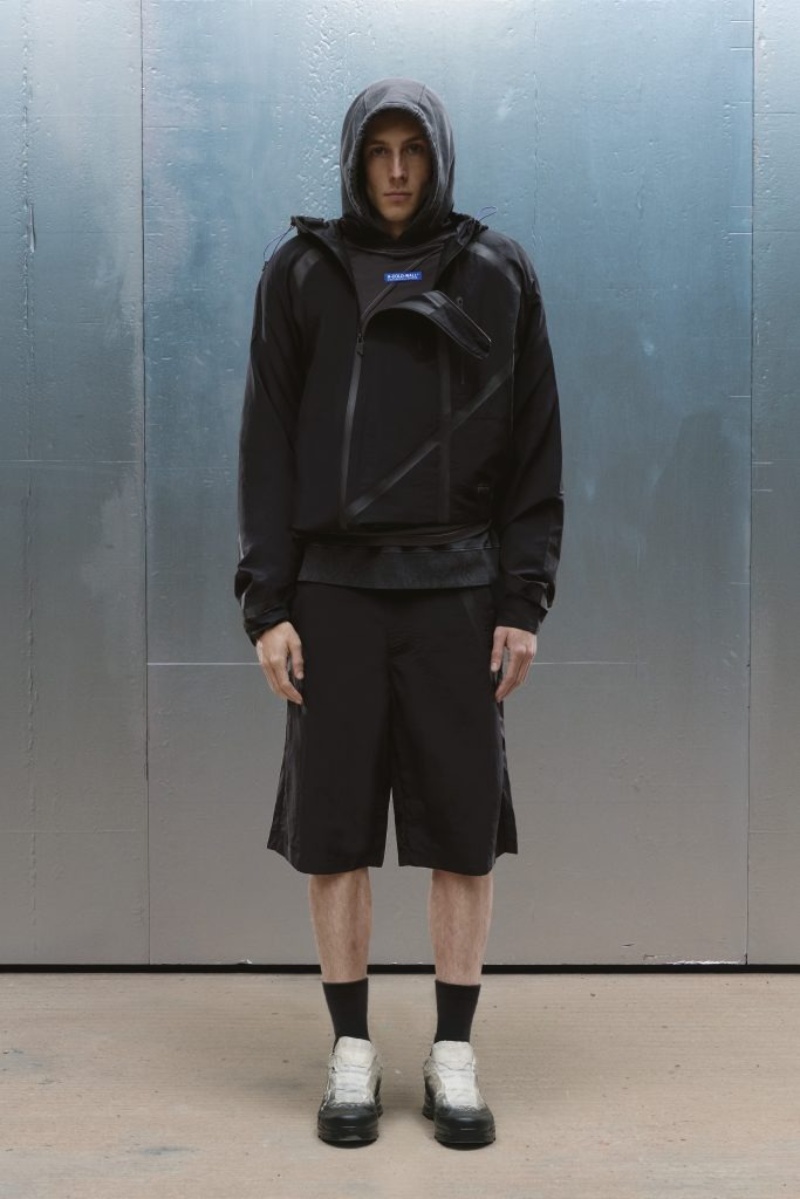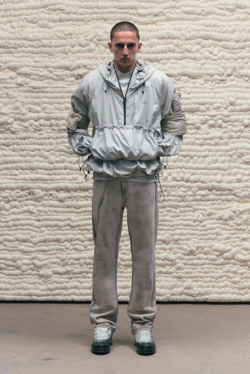 El nuevo armario high street de A-Cold-Wall* SS25 abre con prendas de background deportivo configuradas para lo elevado. Conjuntos técnicos en nylon o chándal de cortavientos (o hoodies) se radicalizan con un corte oversize y capucha. Como punto de exageración, cinchas y frunces acentúan estas piezas para crear nuevos volúmenes y dimensiones. También tenemos una cazadora M-65 de inspiración militar, subvertida con un corte oversize y construcción asimétrica, a juego con acabado desgastado y derelicto.
