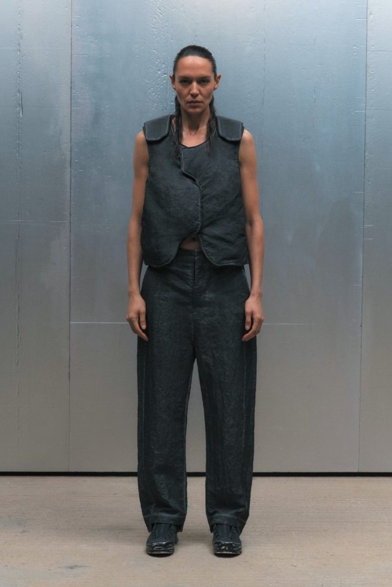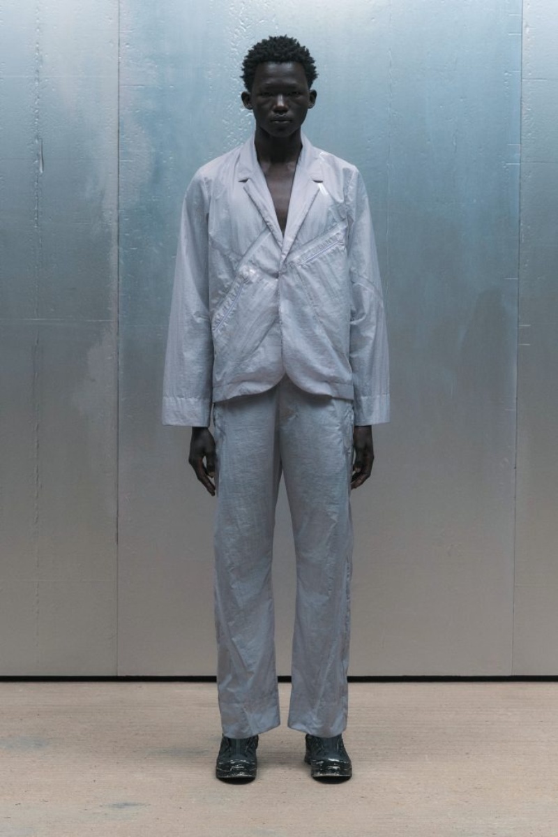Como punto de futurismo, A-Cold-Wall* SS25 presenta un poncho deconstruido de popelina transparente, que sirve como capa de protección ante los elementos (o miradas curiosas). También, el traje de dos piezas recibe una reinvención con tejidos más utilitarios y costuras asimétricas. Aportando textura, tenemos chalecos de punto acanalado y jerséis deconstruidos clásicos del lenguaje ACW*.