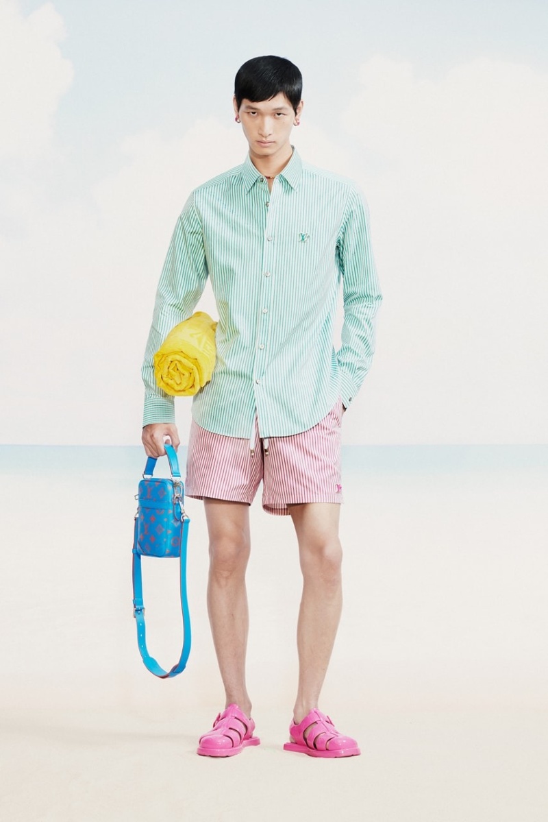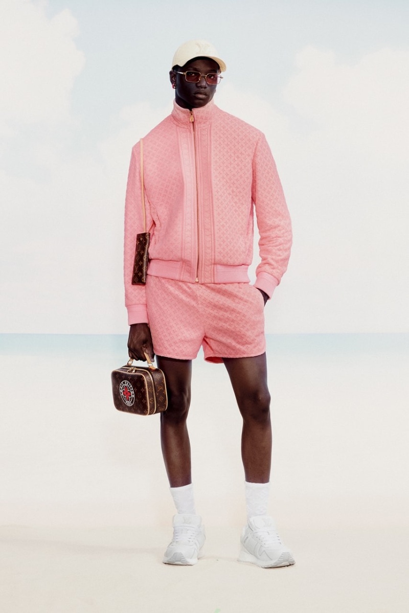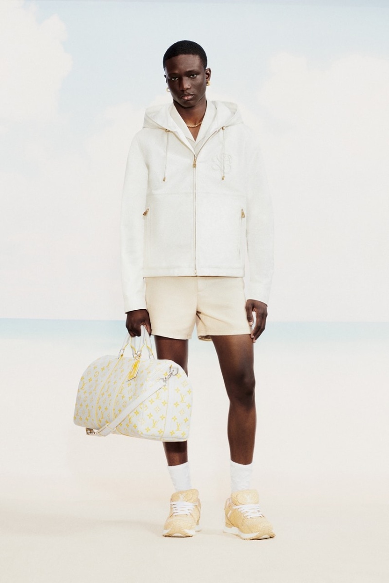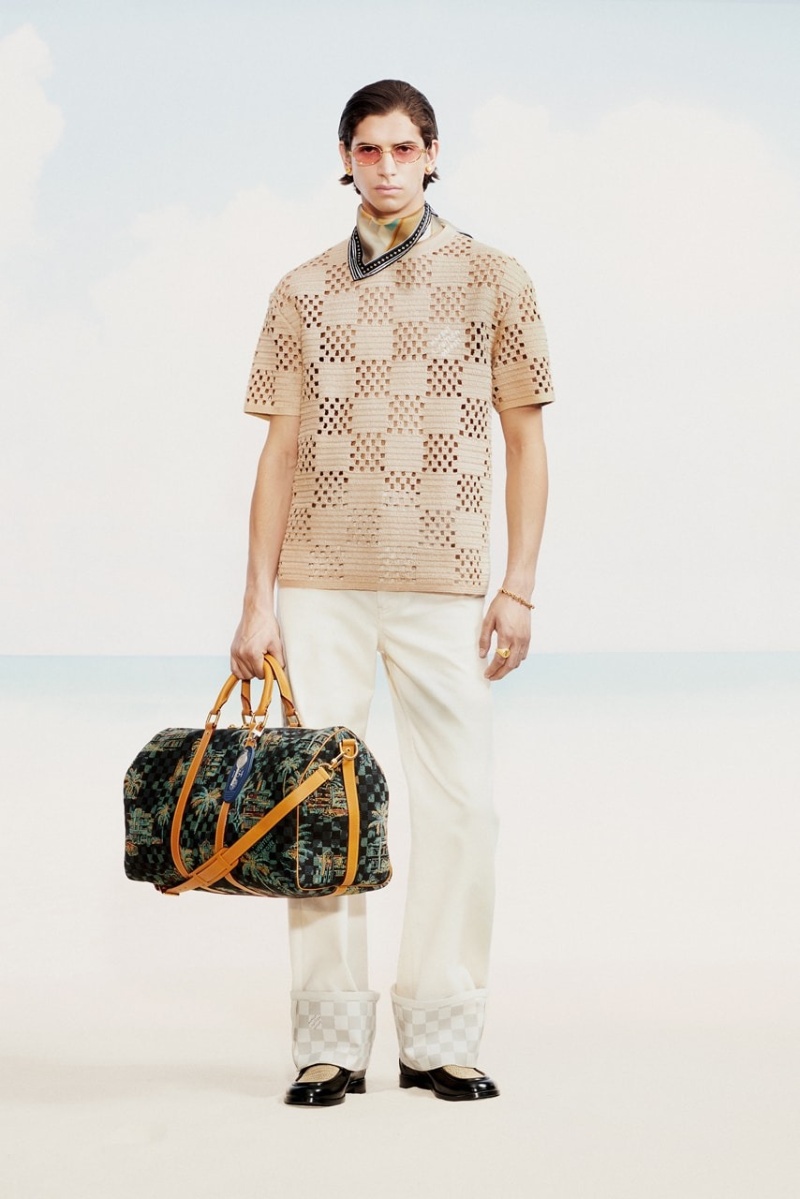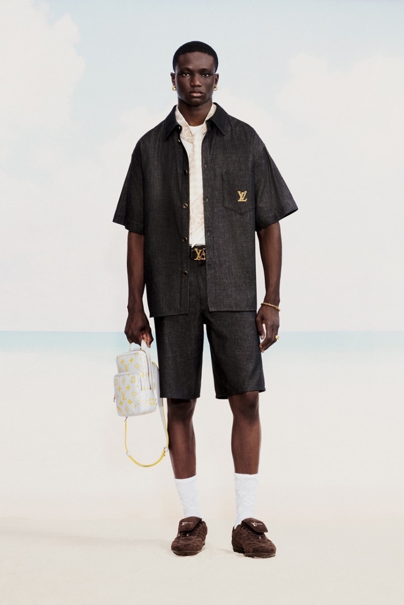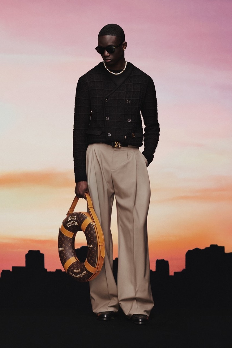 Otro de los puntos fuertes de Louis Vuitton Pre-Fall 2025 es su rango de bolsos, que reinventan siluetas típicas como el Keepall como accesorios multibolsillo ultra clásicos y nostálgicos. También, vemos una que otra construcción fantasiosa, como un bolso en forma de salvavidas o uno en forma de delfín. Los estampados coloridos de Monogram se encargan de acentuar los complementos más urbanos y, como punto así playero, tenemos siluetas también en rafia clásica. En el terreno de calzado, priman las cangrejeras de piel clásicas y siluetas de sneakers que combinan un aire urbano con nostalgia (y ojo con las futboleras en marrón).