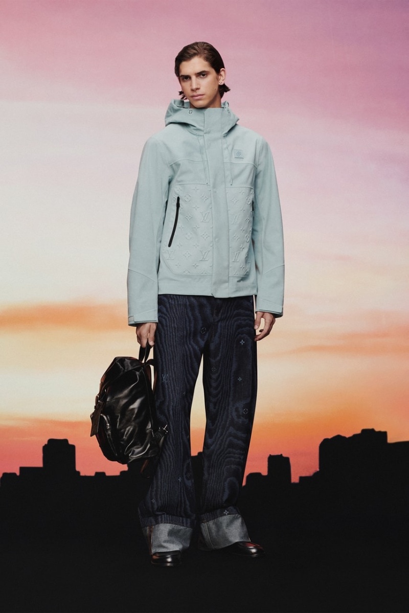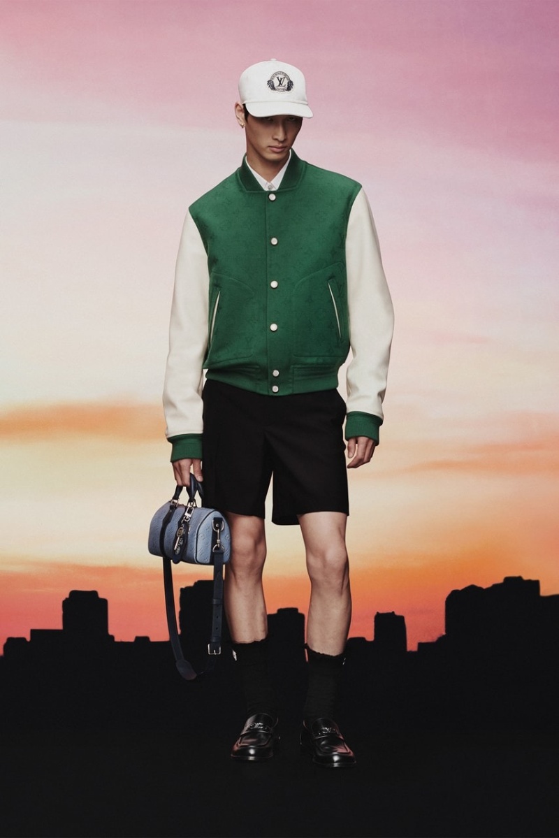 Louis Vuitton Pre-Fall 2025 también destaca en su armario más formal staples como una cazadora Eisenhower de cuero con costuras en diamante (y bermudas cortas a juego), pantalones de sastre cortos y baggy, prendas de punto con detalles de Monogram, conjuntos de texturas statement y calzado formal en piel ultra clásico. Y, como punto de contraste, tenemos siluetas urbanas y funcionales y vaqueros baggy refinados; como por ejemplo el cortavientos en moiré verde.