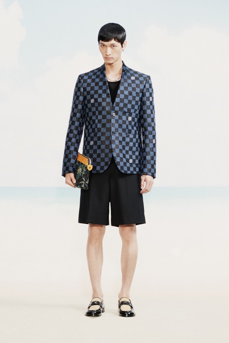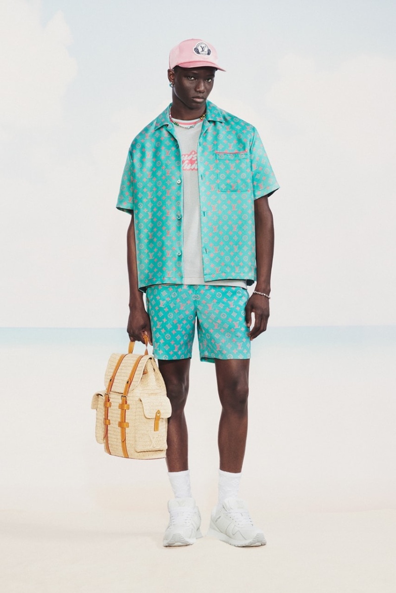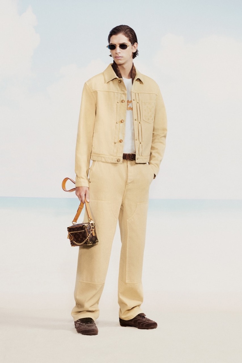 Pasando a los looks de día, Louis Vuitton Pre-Fall 2025 apuesta por mirar al estilo playero de aquel entonces como arquetipo fundamental. En este componente priman sets coordinados de camisa y bermudas de raya Ítaca en los colores más icónicos del estampado. También tenemos estos mismos looks decorados con estampados Monogram en colores de temporada; a parte de más workwear y high street por supuesto. Para los trajes de este armario, vemos siluetas heredadas de Virgil reimaginadas con construcciones de ante y una cazadora de rafia tipo Chanel.