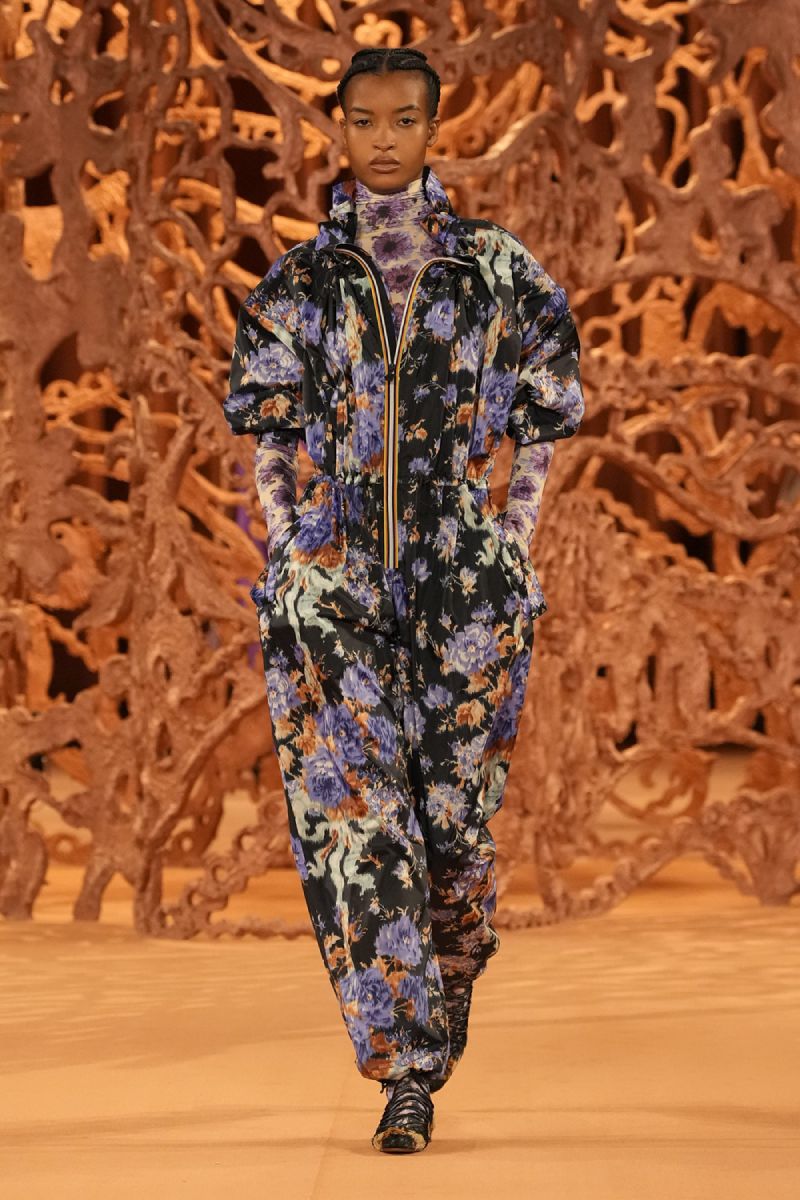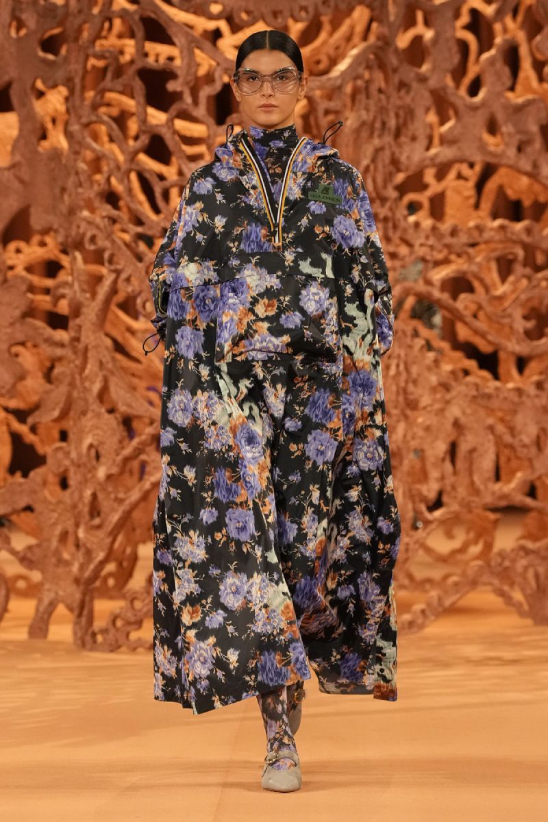 La cápsula impermeable, utilitaria y funcional de K-Way X Ulla Johnson fue presentada en la pasada Fashion Week de Nueva York y no podemos decirlo de otra manera: es un espectáculo. La colección abre con un chubasquero de corte largo con capucha y bolsillo en el pecho. Obviamente, esta y todas las prendas se estampan integralmente con un diseño floral de tonos violetas y look difuminado. Como complementos, tenemos la icónica cremallera de la firma italiana decorando y cerrando el look.