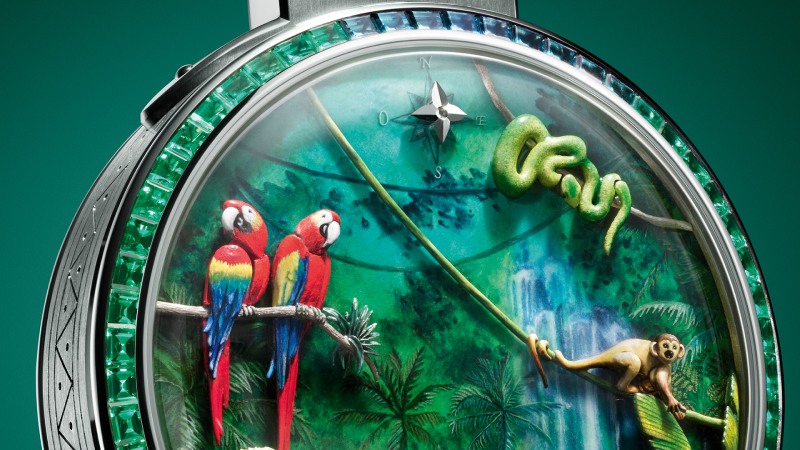 El Escale en Amazonie de Louis Vuitton es especial por muchas cosas, como que es el primer modelo de bolsillo que no se ofrece bajo pedido, sino que forma parte de la colección habitual. Pero también, su construcción y acabados da mucho de qué hablar. Esta pieza de alta relojería nos muestra una escena selvática compuesta en un dial rebosante de técnicas artesanas de esmaltado. Y, como guiño al espíritu aventurero de la maison, vemos una barca capitaneada por un mono que surca un rio con un set completo de baúles de la maison. Ahora bien, ¿cómo se lee la hora? Pues en el caseback. Este reloj hace un guiño a los relojes de bolsillo de antaño y deja ver la escena animada al completo en el dial. Al pulsar un botón, la barca comienza a navegar a medida de los baúles comienzan a abrirse y de ellos, emanan flores doradas del icónico Monogram LV.