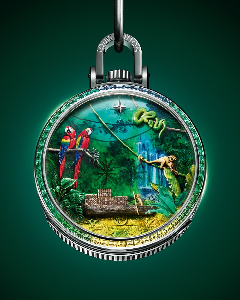 Ahora, en su misión por estar en constante evolución y reinvención, la Fabrique du Temps presenta una nueva serie de creaciones que encabezan la propuesta de relojes de Louis Vuitton Alta Relojería. Aquí, encontramos una nueva versión del emblemático Tambour inspirado en la cultura japonesa y otro que mira a la exploración espacial como tema central. Y, como broche de oro, tenemos un Escale convertido a reloj de bolsillo con theme selvático de verdadero espectáculo.