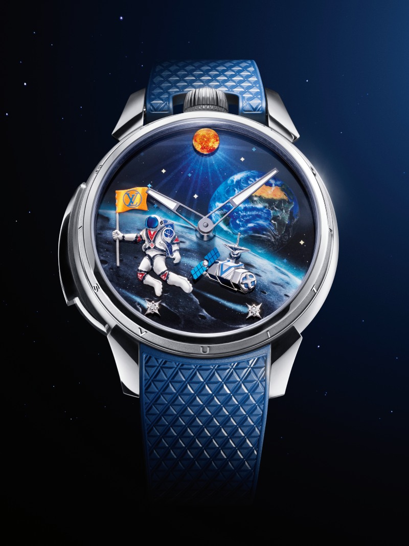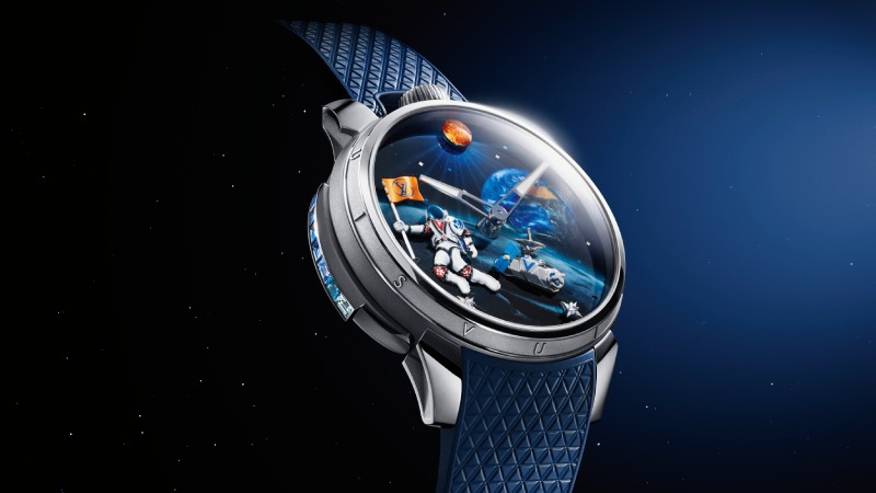 Siguiendo la misma línea de mecanismos con autómatas, el segundo modelo de Louis Vuitton Alta Relojería mira a la exploración espacial como fuente de inspiración. El Tambour Taiko Galactique presenta una composición mucho menos intricada, pero igual de espectacular. En el dial nos encontramos las agujas de horas y minutos en el centro, pero lo interesante está en el background: una escena espacial animada. La coreografía empieza con el pulsador accionado, el astronauta comienza a ondear su bandera color azafrán. Al mismo tiempo, el satélite comienza a desplegar su antena, paneles solares y propulsor; el sol y las estrellas comienzan a girar en distintas velocidades, creando así una escena perfectamente sincronizada. Y esto, como feat de ingeniería relojera, no interfiere con la medición del tiempo “estándar”