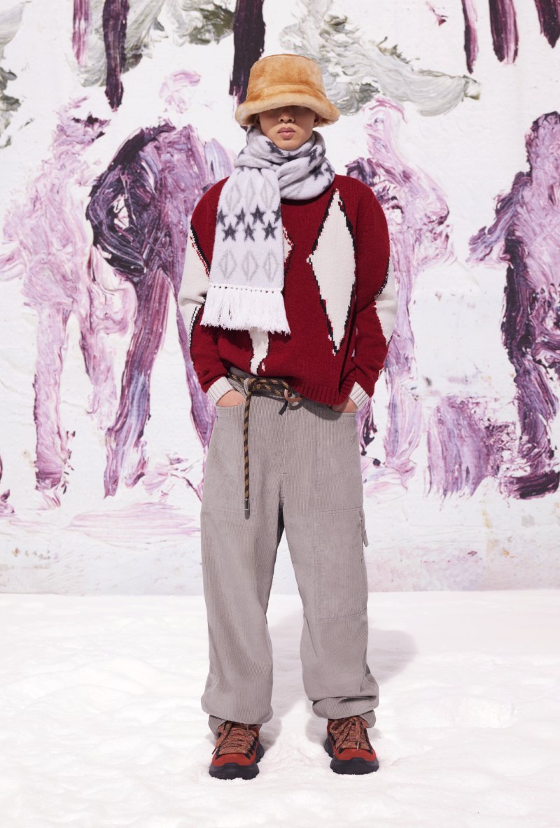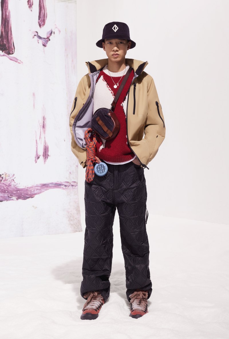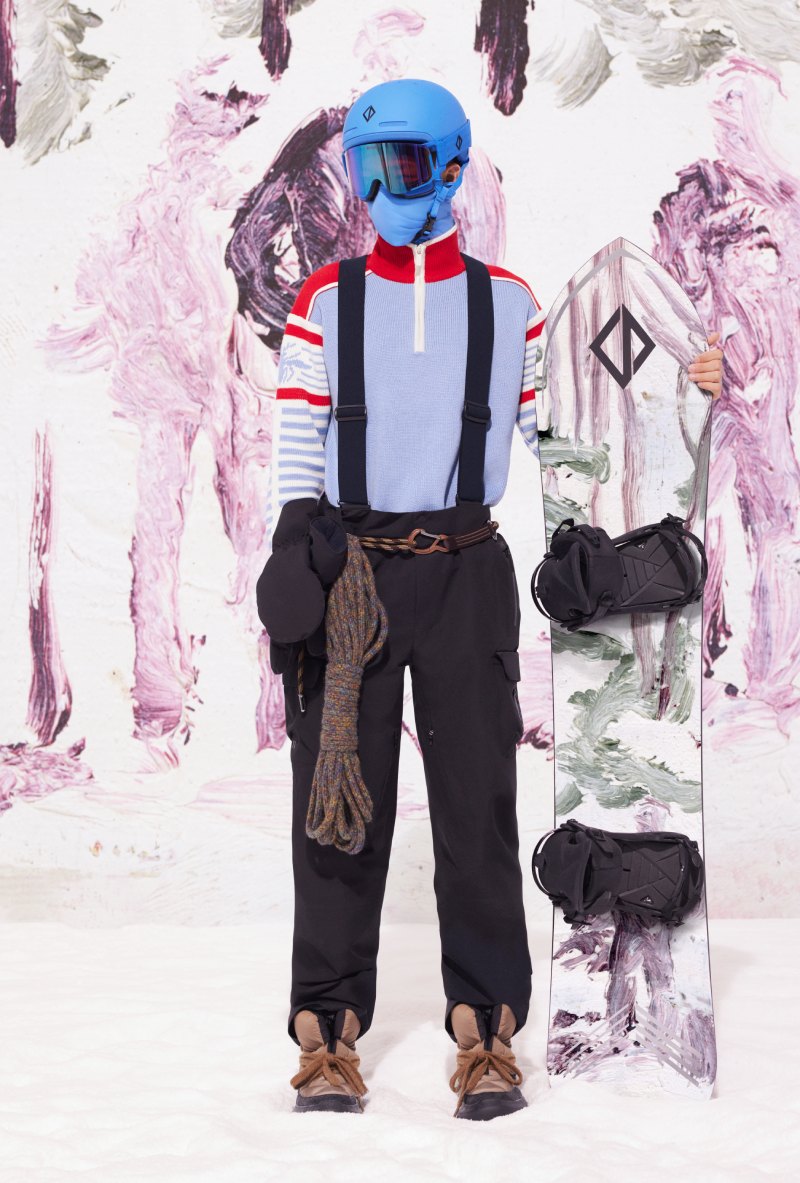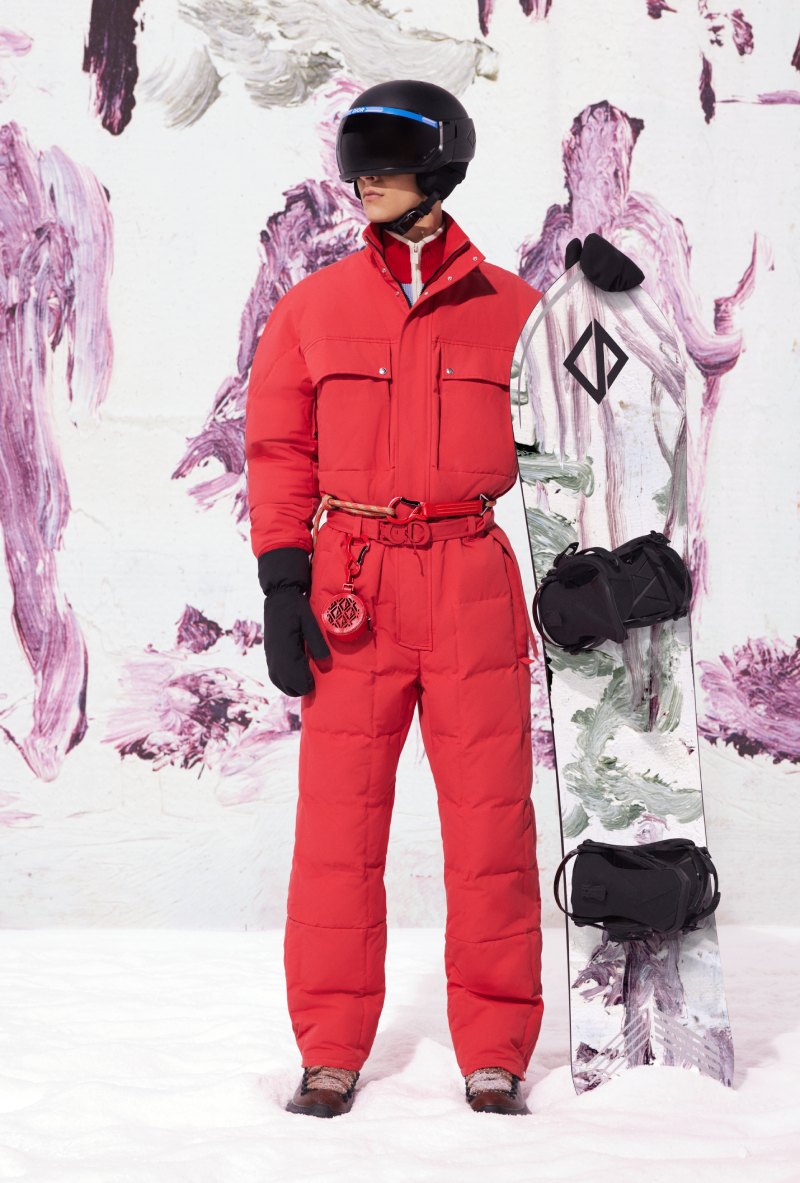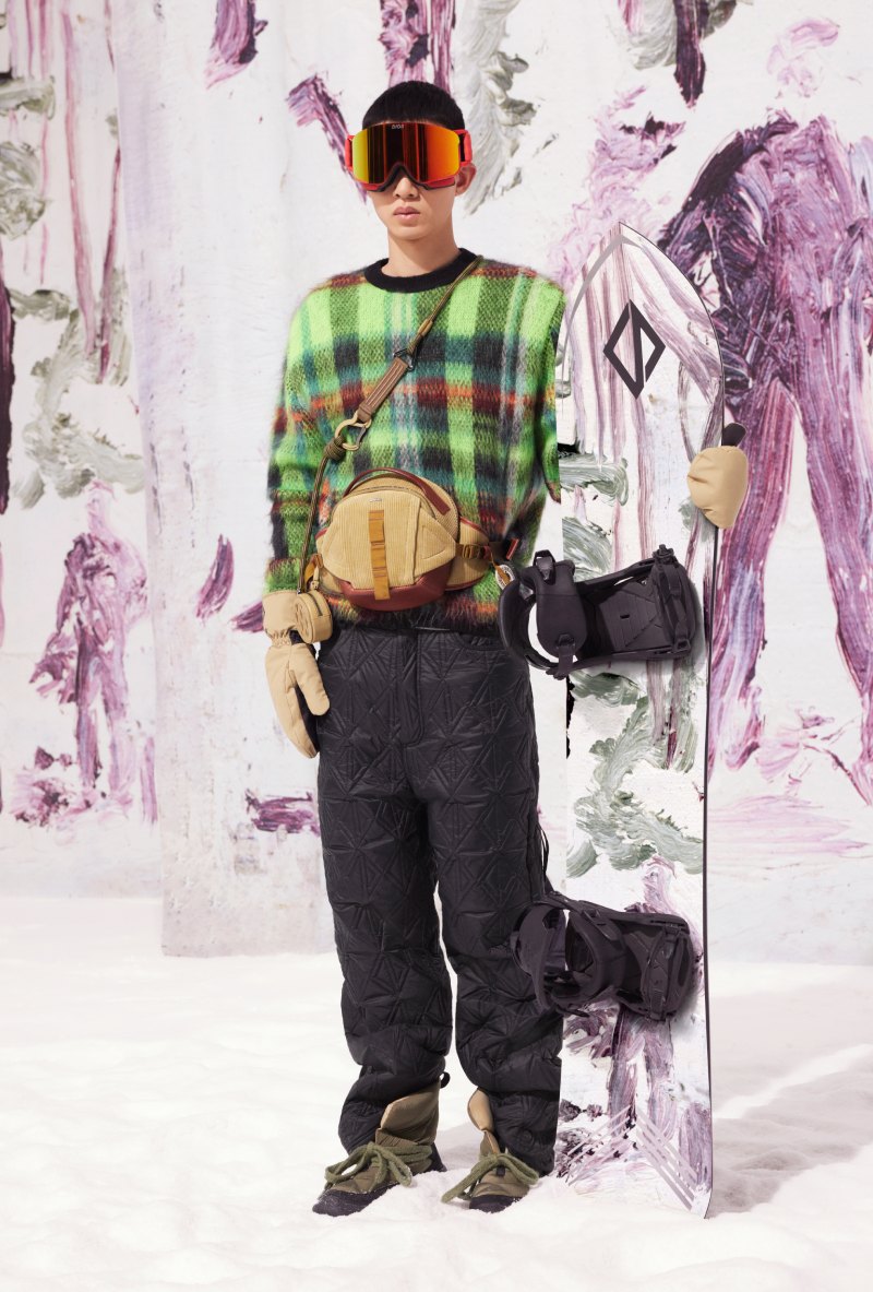 En cuanto a los accesorios, Dior nos ofrece un poco de todo. Desde siluetas de calzado pensadas para la nieve y botas de aire hiking hasta alguna de la mejor indumentaria para hacer deporte. Aquí, las gafas y los cascos se han hecho en colaboración con POC, mezclando el saber hacer de la firma con un aire de sofisticación urbana, que se coronan también con el CD Diamond. También nos encontramos con guates de esquí que completan la equipación funcional. Y, para los más atrevidos, se ha elaborado también una tabla de snowboard en colaboración con AK Ski decorada con motivos de Peter Doig también.