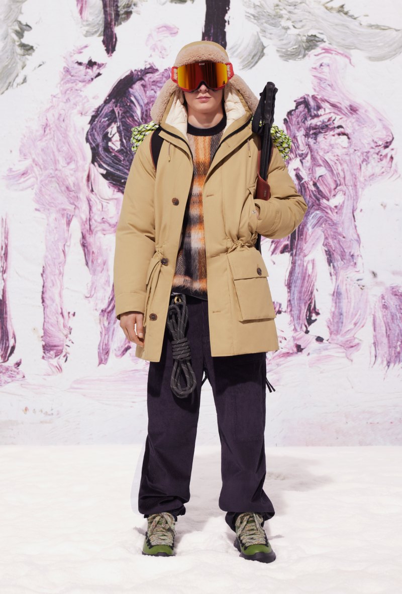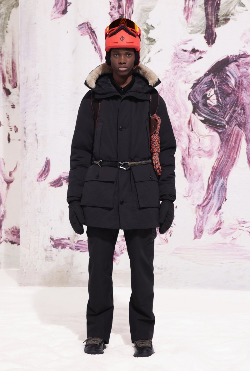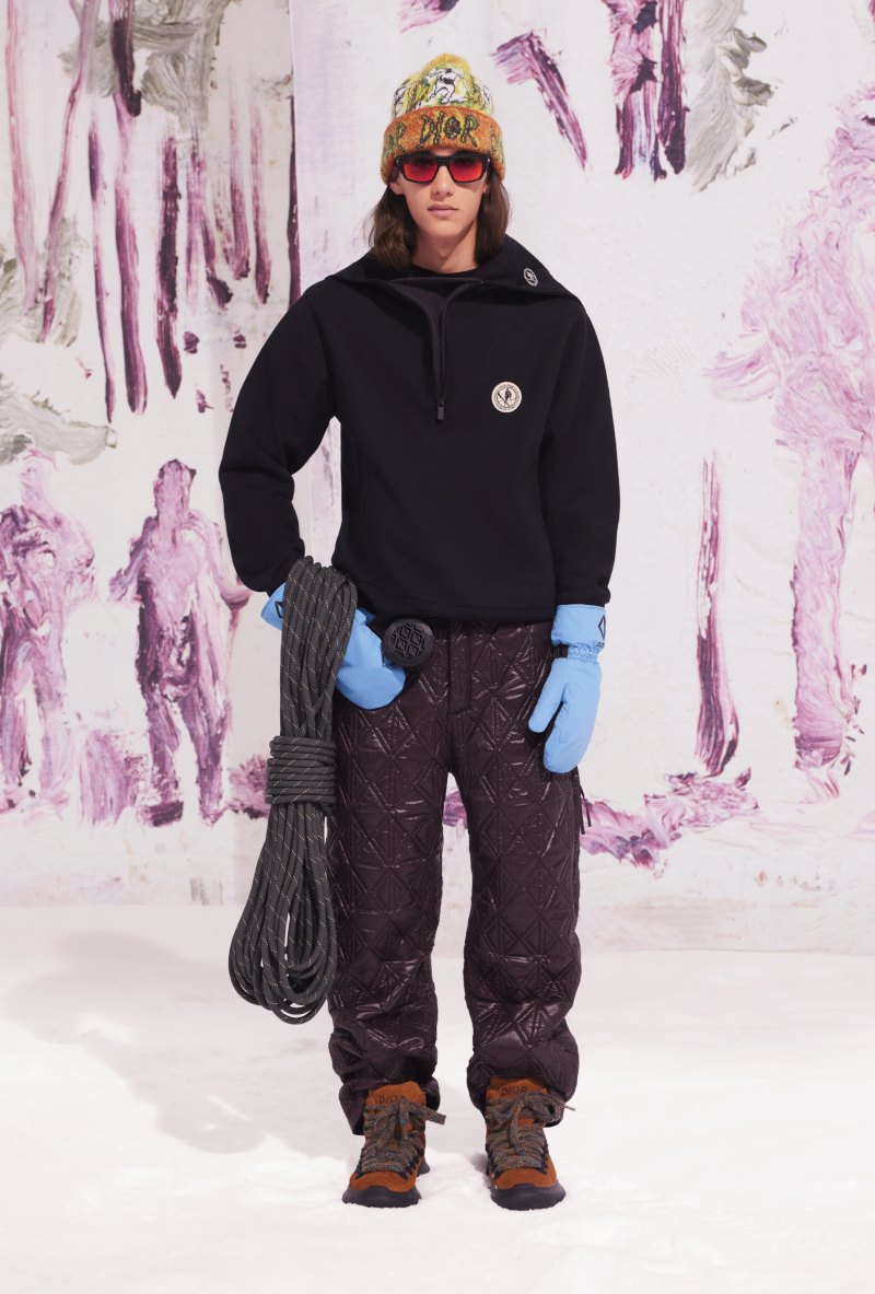 La colección de ropa de esquí de Dior abre con prendas de outerwear pensadas tanto como la forma como para la función. Las prendas acolchadas, un esencial en pistas y calles en la temporada, se presentan con siluetas más refinadas y estilos más curados. Abrigos puffer, parkas con capuchas de pelo, y gilets componen esta oferta. En el lado más enfocado a los deportes, nos encontramos con monos de esquiar y pantalones acolchados, algunos acentuados por el emblemático motivo CD Diamond en su costura exterior. Chaquetas oversized de pelo en colores lisos o con estampados de Doig se encargan de completar la selección.