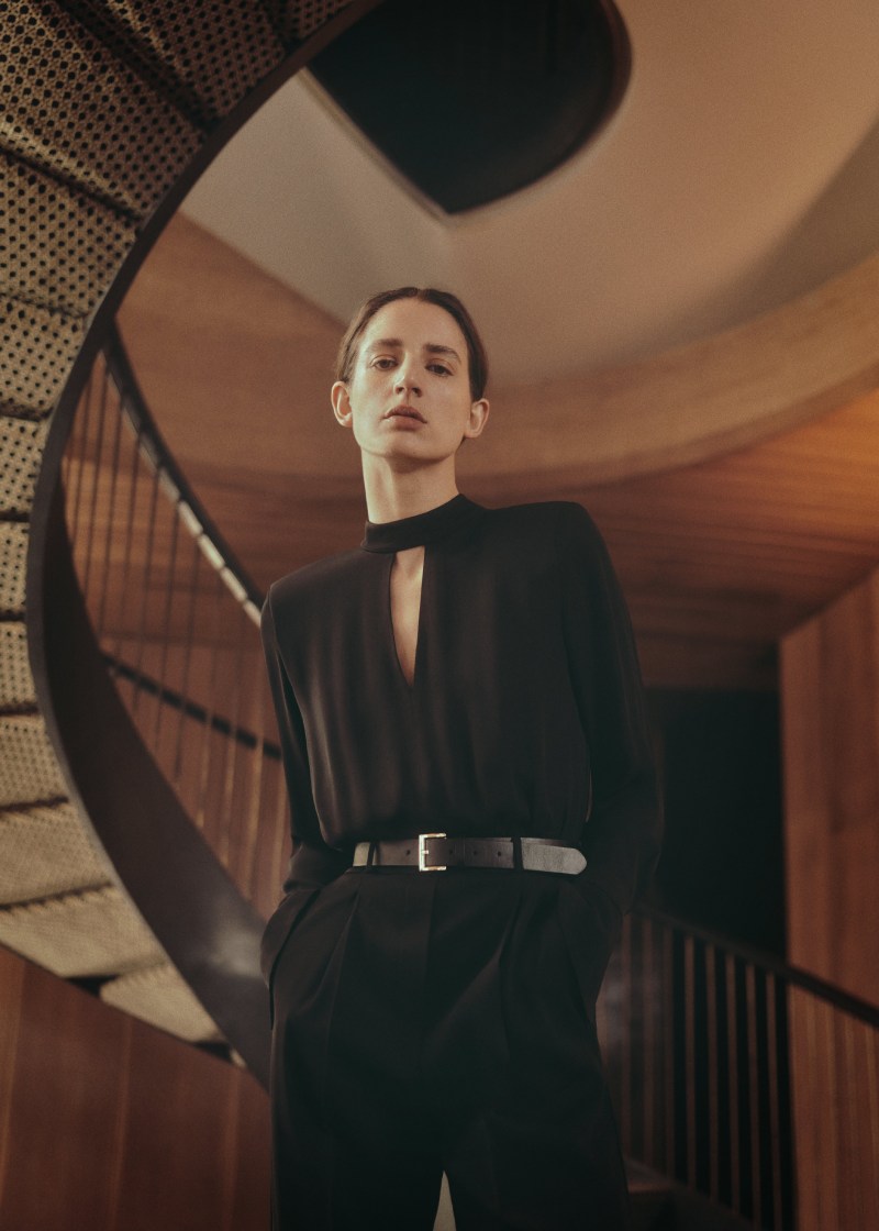 Esta colección de sastrería femenina también apuesta por reinterpretaciones más casuales de esta corriente menswear. Pantalones acampanados de pinzas, faldas en la misma línea, camisería casual… un poco de todo. También, elementos más sport de la tendencia menswear se cuelan a la mezcla: como un polo knit transformado a vestido o un cuello Perkins transformado a blusa. Como accesorios, tenemos complementos en piel negra ultra minimal para cerrarlo todo con broche de oro.