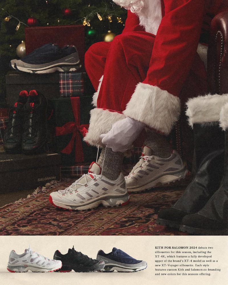 Pasando al calzado, la colección Kithmas 2024 estrena una súper colabo de sneakers junto a Salomon. Esta entrega estrena las XT-4K, una versión actualizada por Feig de las míticas runners de la firma francesa. También tenemos la nueva silueta XT-Voyager, con un perfil más chunky; ambas siluetas vienen cargadas de branding colaborativo de Kith. Y para estar por casa, la colección presenta unas slippers de pelo de oveja con el icónico monograma de la firma en colores típicos de sus lanzamientos.