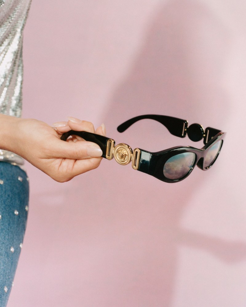 Pero, también hay modelos completamente nuevos dentro de la familia Medusa Biggie. Por ejemplo, los que lleva Sabrina son una versión cat-eye del modelo, que mezclan nostalgia de los 90 con toques de inspiración de los 50’s. Y, como punto de referencia a la era dorada del hip-hop, también tenemos una montura Medusa Biggie con un marco completamente metálico y cristales oversize, también con su medallón dorado.