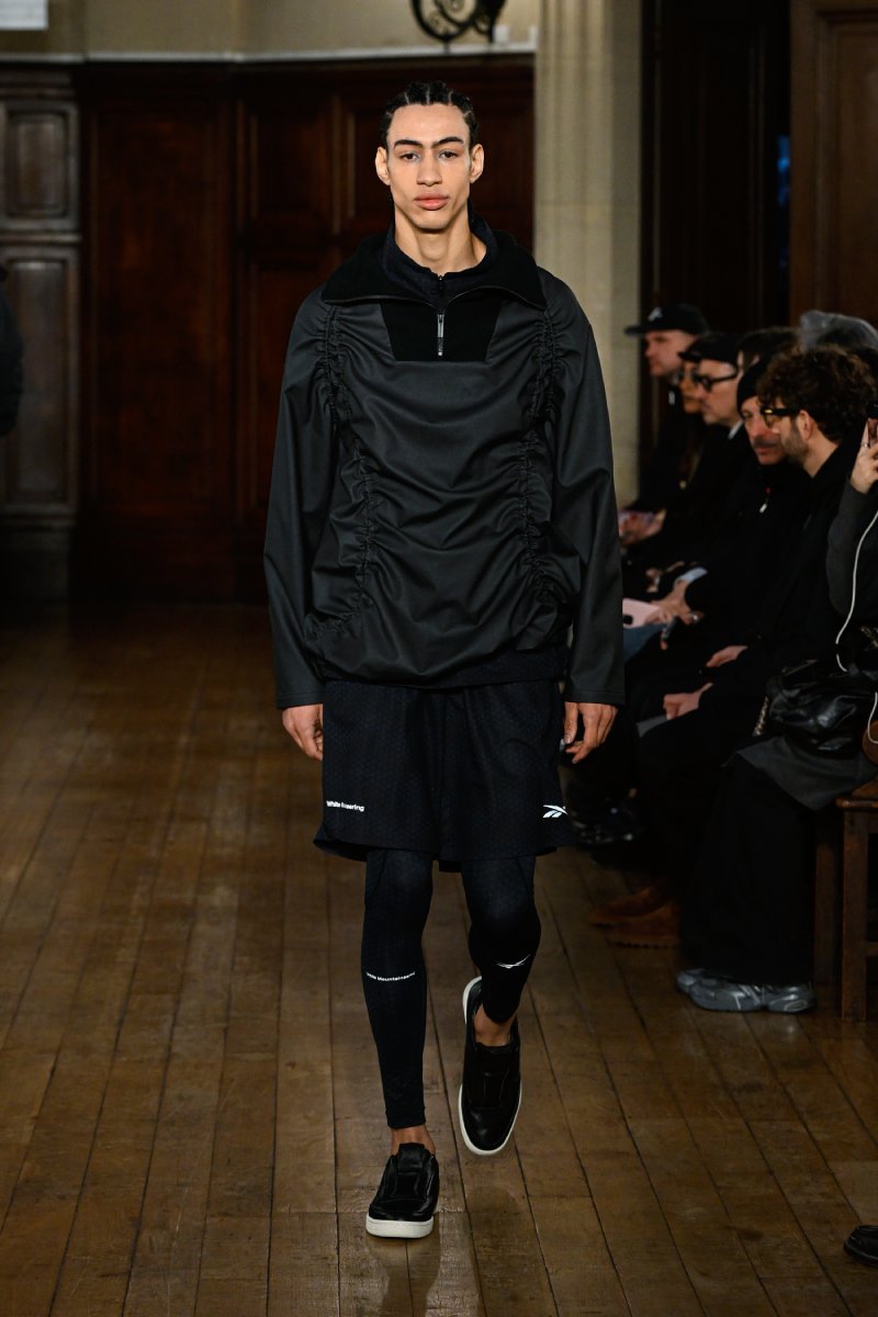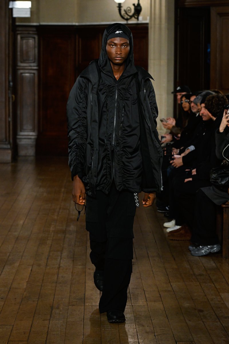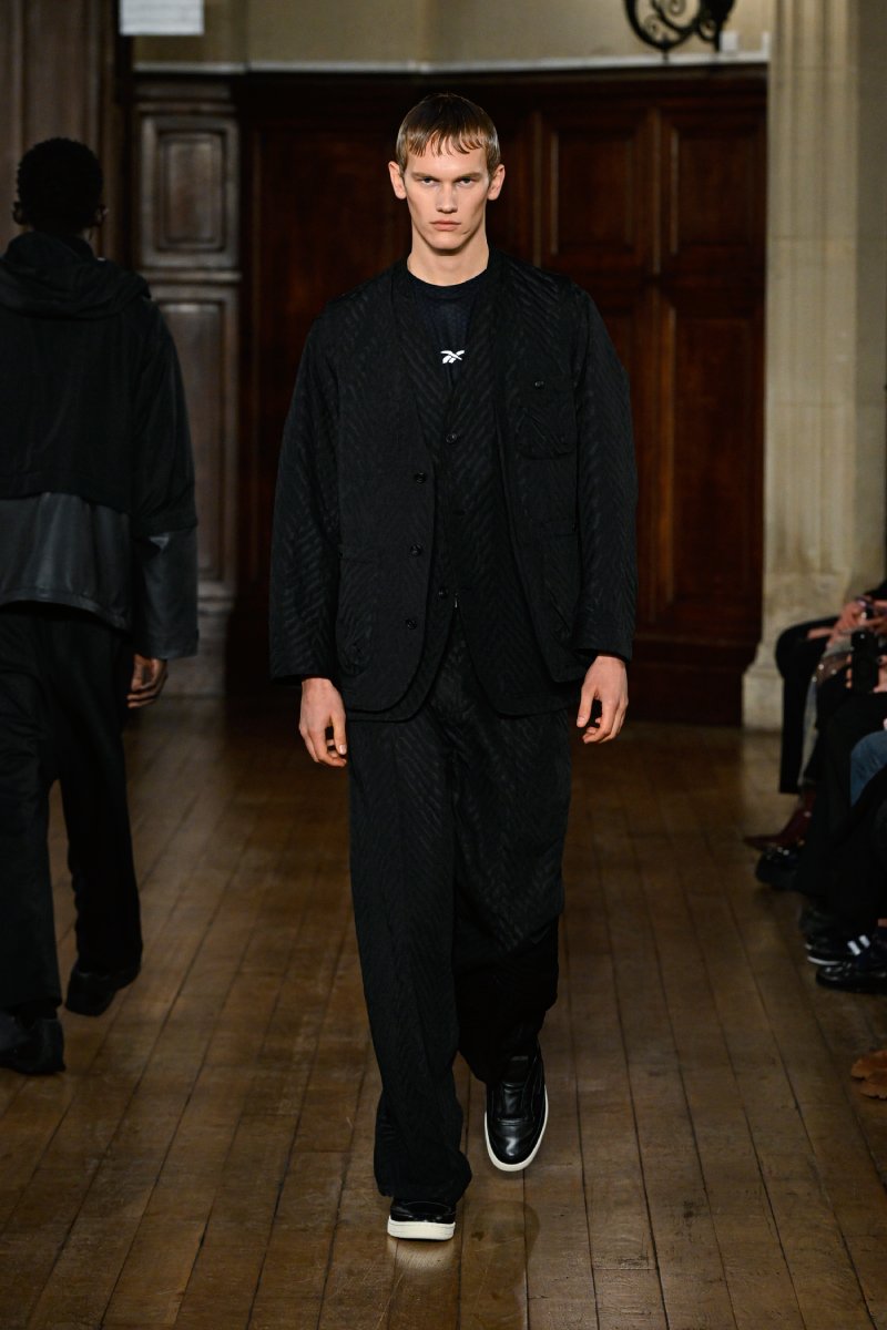 Luego, White Mountaineering FW25 se torna un tanto futurista y avant-garde con sus looks más funcionales y radicales. Este repertorio de looks negros, oversize y de tejidos técnicos aportan dramatismo a la cuestión. Y, por si os lo habéis perdido, hacen muestra de algunas de las mejores colabos de la temporada, como Reebok Y Umbro, por ejemplo (ojo con el look de arnés).