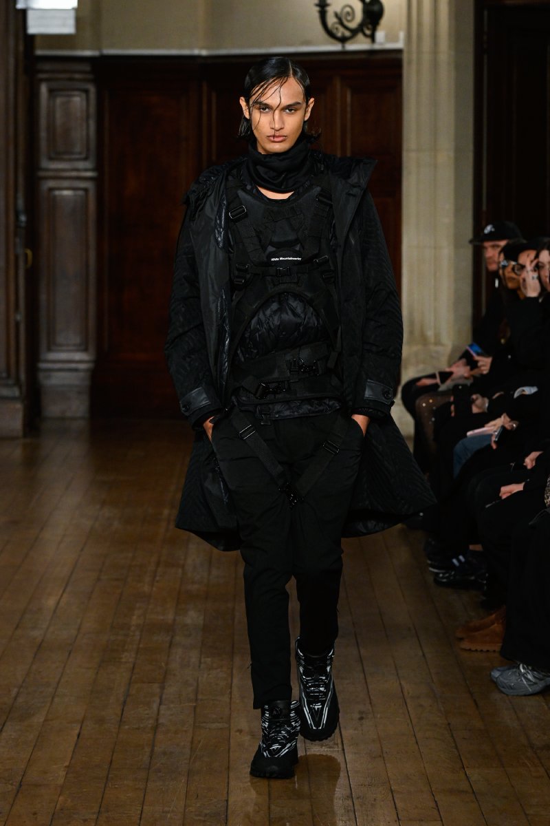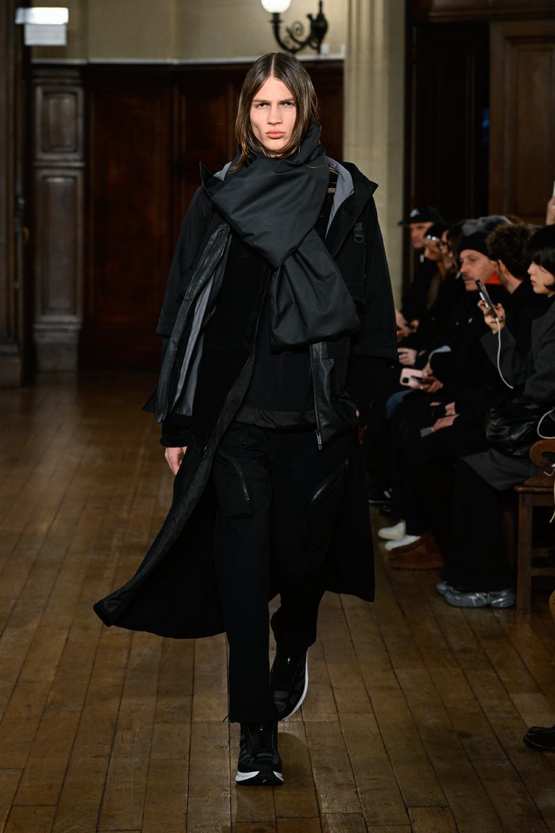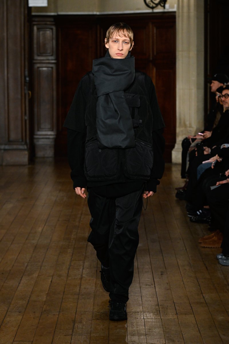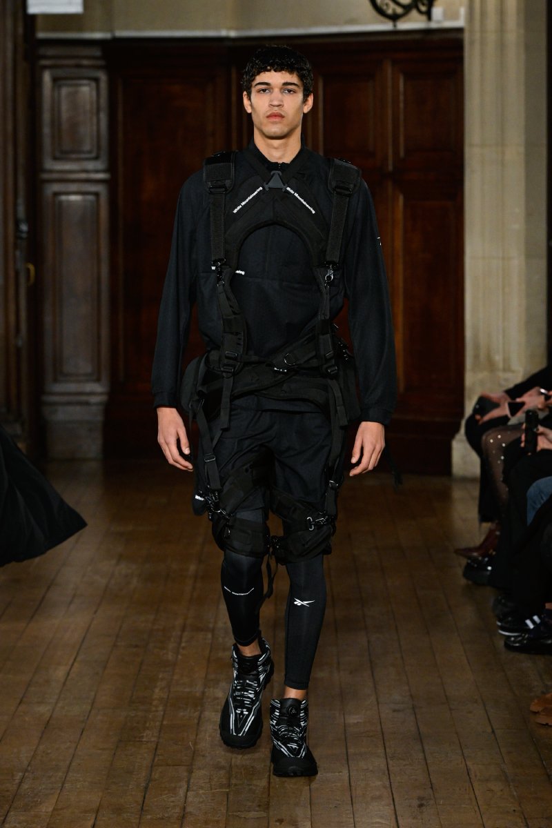 Luego, White Mountaineering FW25 se torna un tanto futurista y avant-garde con sus looks más funcionales y radicales. Este repertorio de looks negros, oversize y de tejidos técnicos aportan dramatismo a la cuestión. Y, por si os lo habéis perdido, hacen muestra de algunas de las mejores colabos de la temporada, como Reebok Y Umbro, por ejemplo (ojo con el look de arnés).