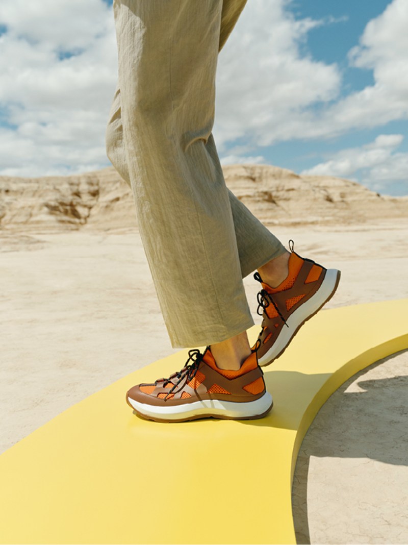 La nueva colección de zapatillas Hermès abre con su modelo Jet, construido típicamente en nylon técnico y arrugado. La nueva versión presenta un upper de punto abierto en colores neutrales acentuados con paneles de ante de oveja. Como punto de acento, vemos una H dinámica decorando el medial y una suela de tacos gum solapando goma blanca. En esa misma línea de mezcla de materiales, tenemos nuevas versiones de las Deep con cuerpos de canvas y refuerzos en piel (también con formatos mule).