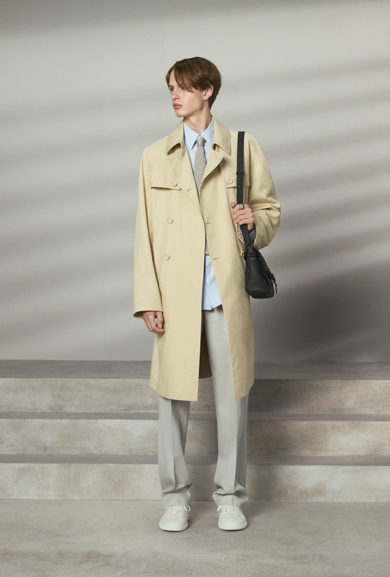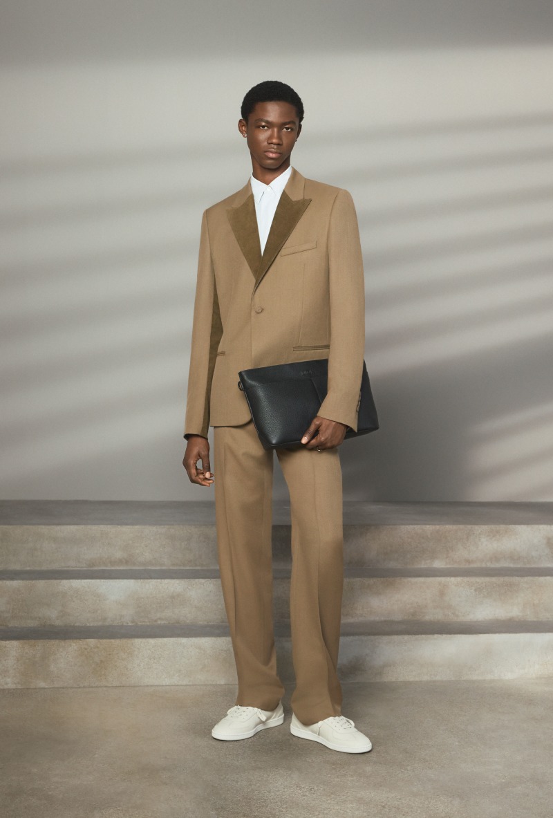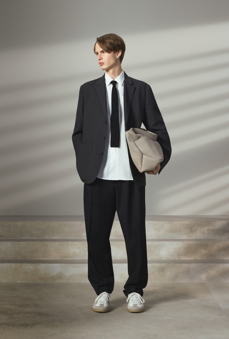 Durante esa época, la sastrería era una de las corrientes de estilo más extendidas en la escalera de clases sociales y Dior Men Fall 2025 toma eso como uno de sus pilares fundamentales. Al igual que los trajes de los 80, la sastrería de esta nueva entrega se presenta con cortes relajados, amplios y muy bien estructurados. Todos san un semblante effortless tanto en el ambiente laboral como para el tiempo de ocio. Sin embargo, estos conjuntos se construyen con una meticulosidad impecable cargada de pequeños tropes del lenguaje de Jones en estos terrenos: simplificaciones, bolsillos utilitarios. Estos looks se complementan con outerwear en la misma línea, camisas Oxford ultra clásicas y corbatas de punta cuadrada (otro staple súper popular de los 80).
