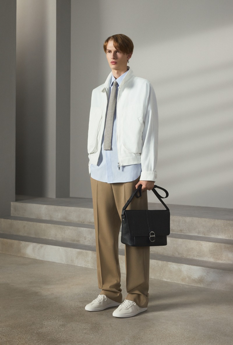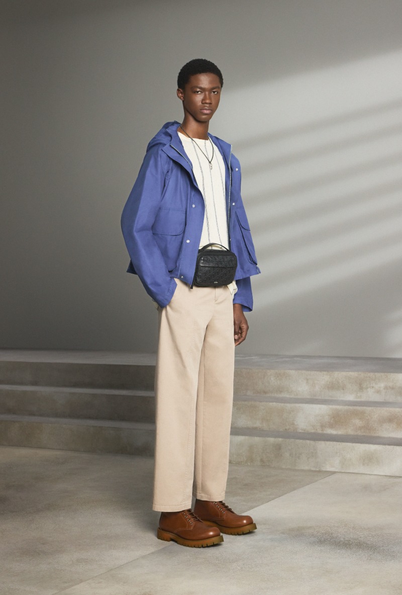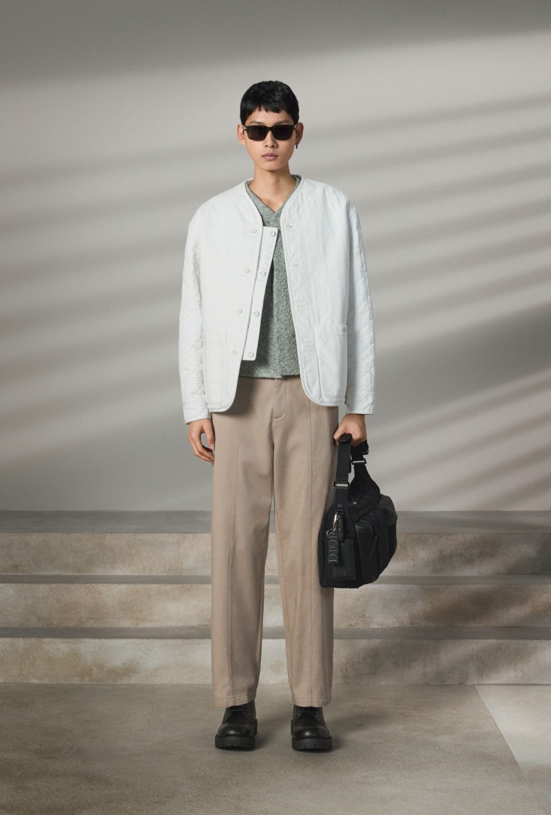 En el terreno de lo casual, Dior Men Fall 2025 profundiza en el mestizaje menswear-streetwear de Jones con esenciales de corte relajado y proporciones generosas. Las cazadoras varsity o harrington, las gabardinas clásicas y las bombers de los armarios más preppy se contrastan con iconos urbanos como una biker de cuero negro deconstruida, un combo de camiseta manga larga de rayas con una photo tee y sudaderas tipo hoodie. Así como piezas estrella, tenemos una cazadora universitaria con cuello Byron y mangas de Cannage y una bomber cropped de piel, ambas en beige ultra clásico. Hablando de, el pantalón por excelencia de la colección son los khakis, que se reimaginan con un corte más holgado y permiten su cabida en conjuntos más callejeros.