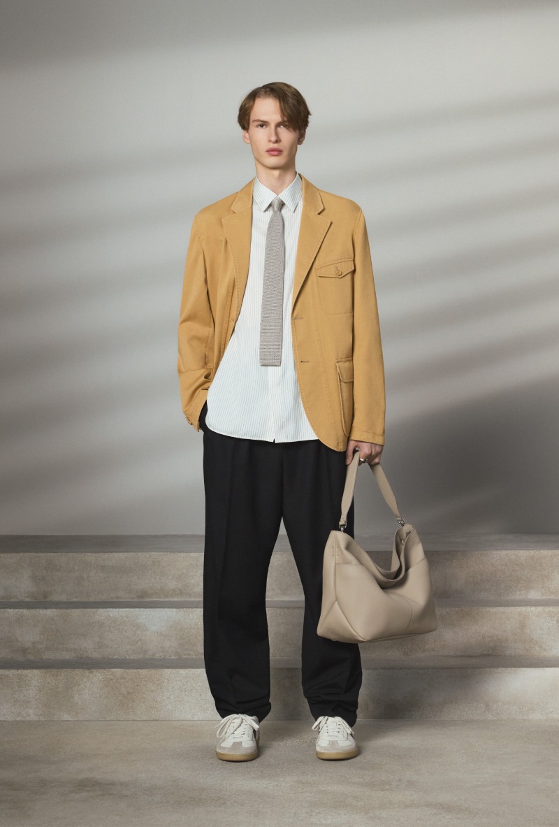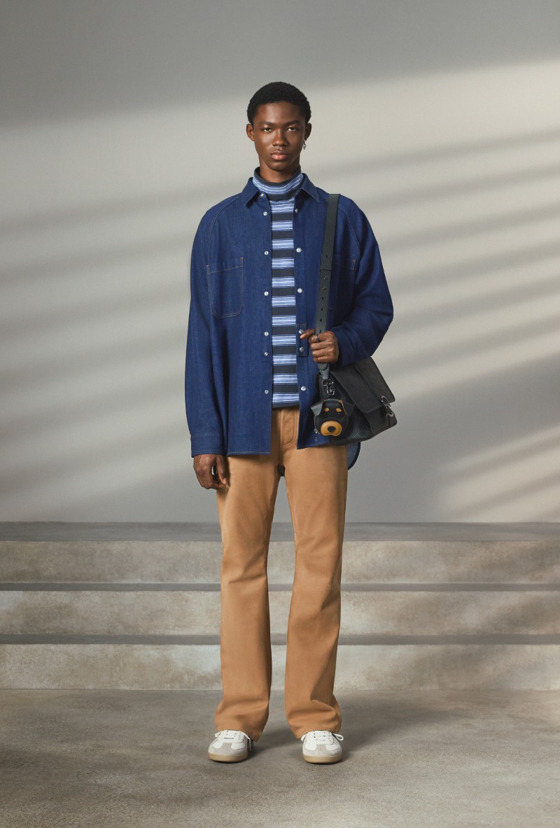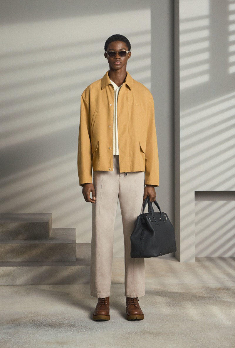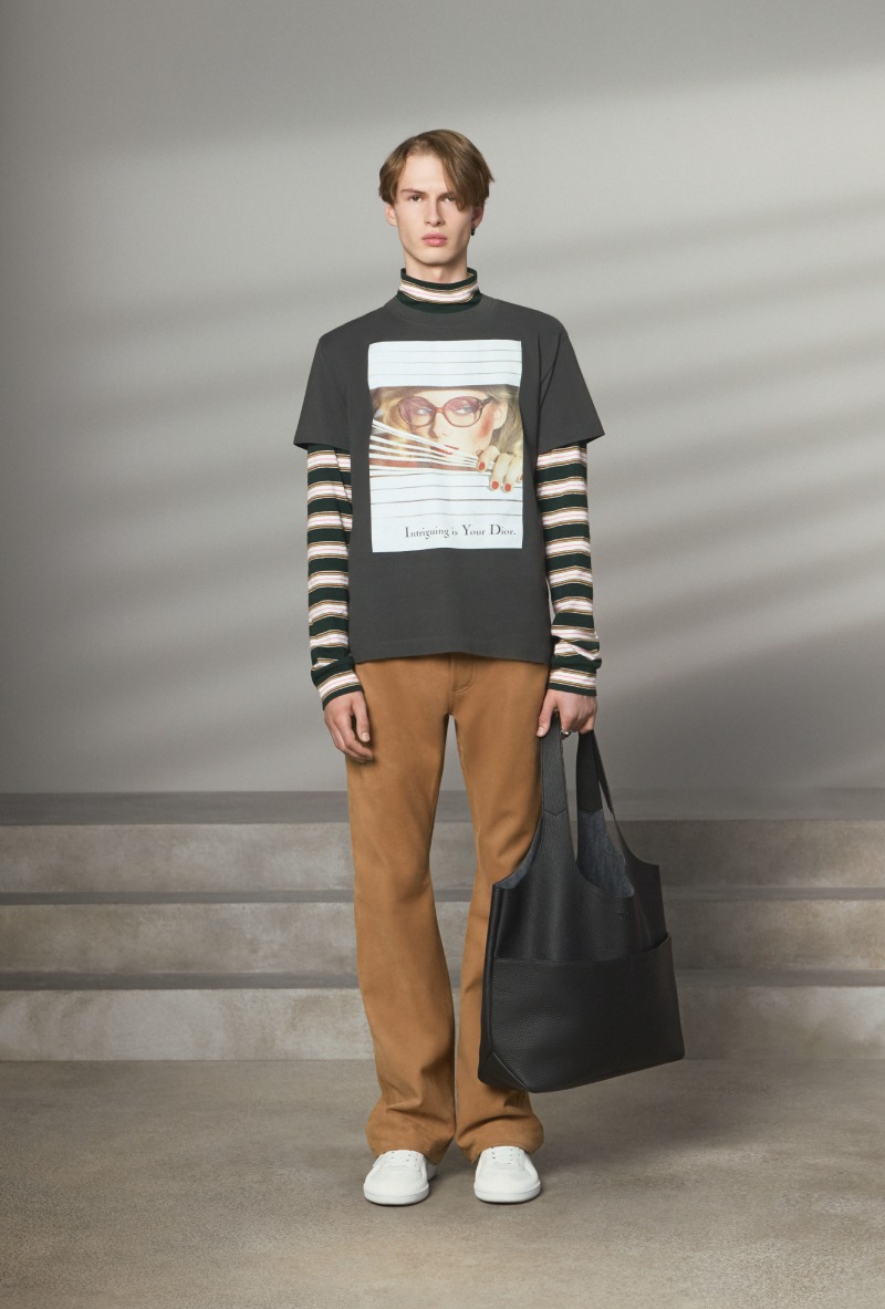 En el terreno de lo casual, Dior Men Fall 2025 profundiza en el mestizaje menswear-streetwear de Jones con esenciales de corte relajado y proporciones generosas. Las cazadoras varsity o harrington, las gabardinas clásicas y las bombers de los armarios más preppy se contrastan con iconos urbanos como una biker de cuero negro deconstruida, un combo de camiseta manga larga de rayas con una photo tee y sudaderas tipo hoodie. Así como piezas estrella, tenemos una cazadora universitaria con cuello Byron y mangas de Cannage y una bomber cropped de piel, ambas en beige ultra clásico. Hablando de, el pantalón por excelencia de la colección son los khakis, que se reimaginan con un corte más holgado y permiten su cabida en conjuntos más callejeros.