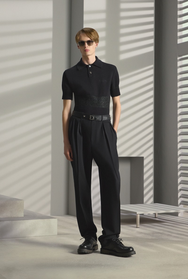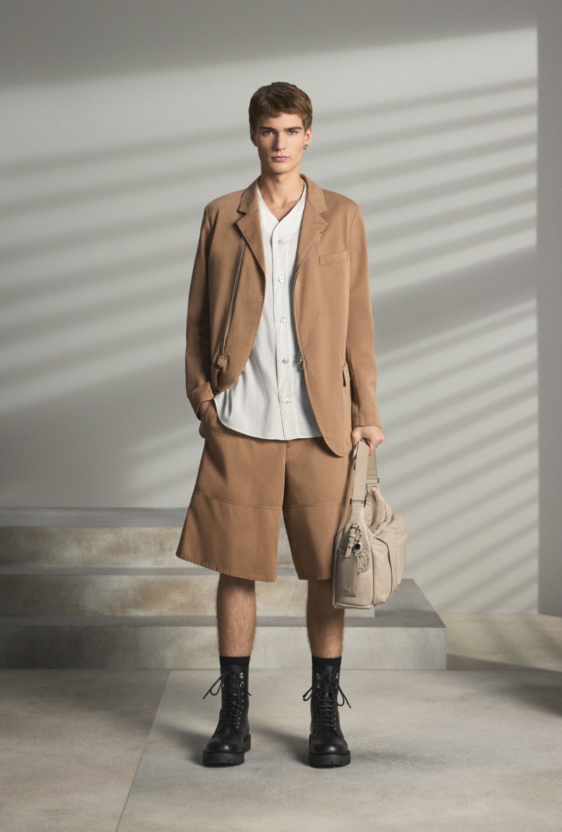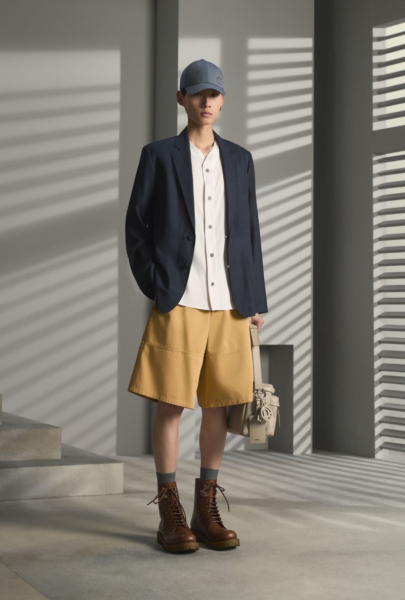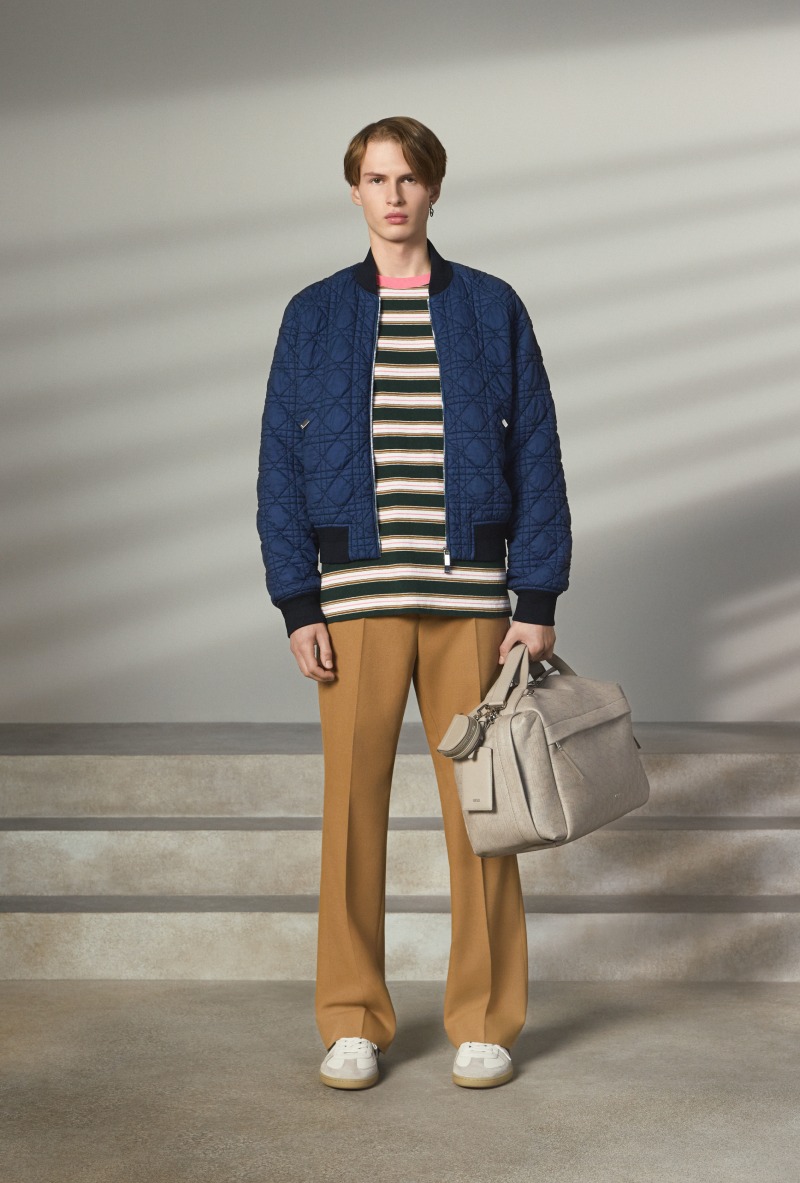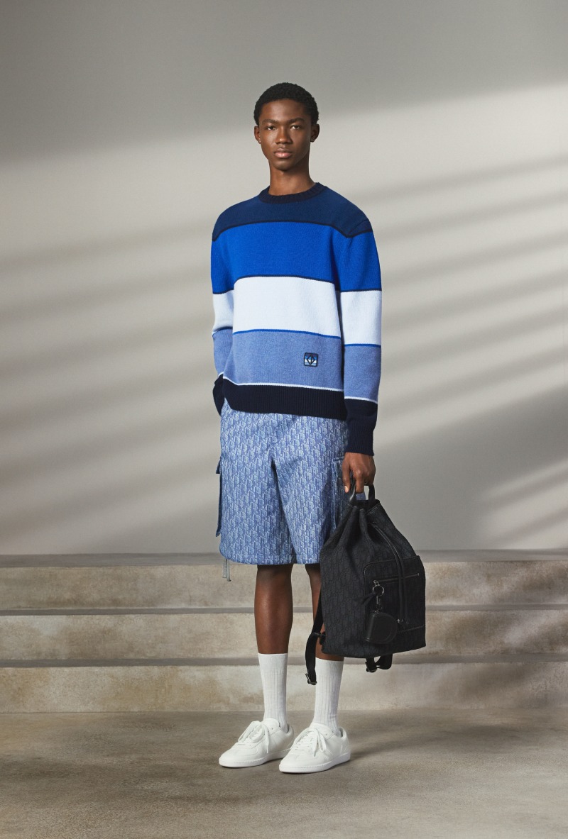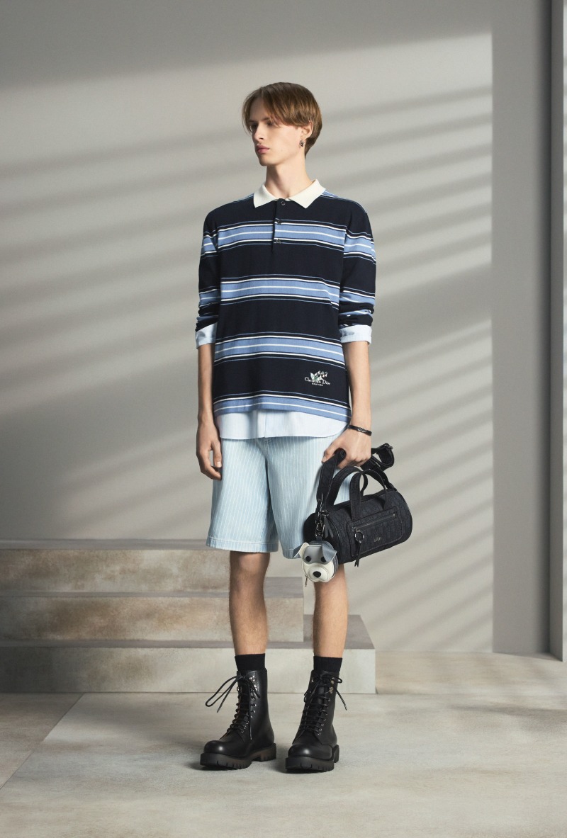 Otro de los puntos fuertes de Dior Men Fall 2025 es el estampado de rayas clásico; otro elemento unificador en estos tipos de armario. Esto resalta dentro del repertorio más casual, dejándose ver en camisetas, jerséis, bermudas, polos de rugby. También tenemos unas bermudas cargo con patrón Oblique y un chaleco utility para cerrar los looks.