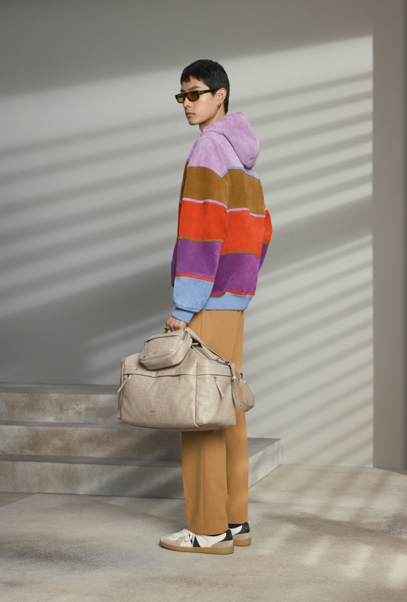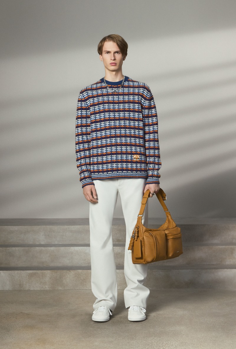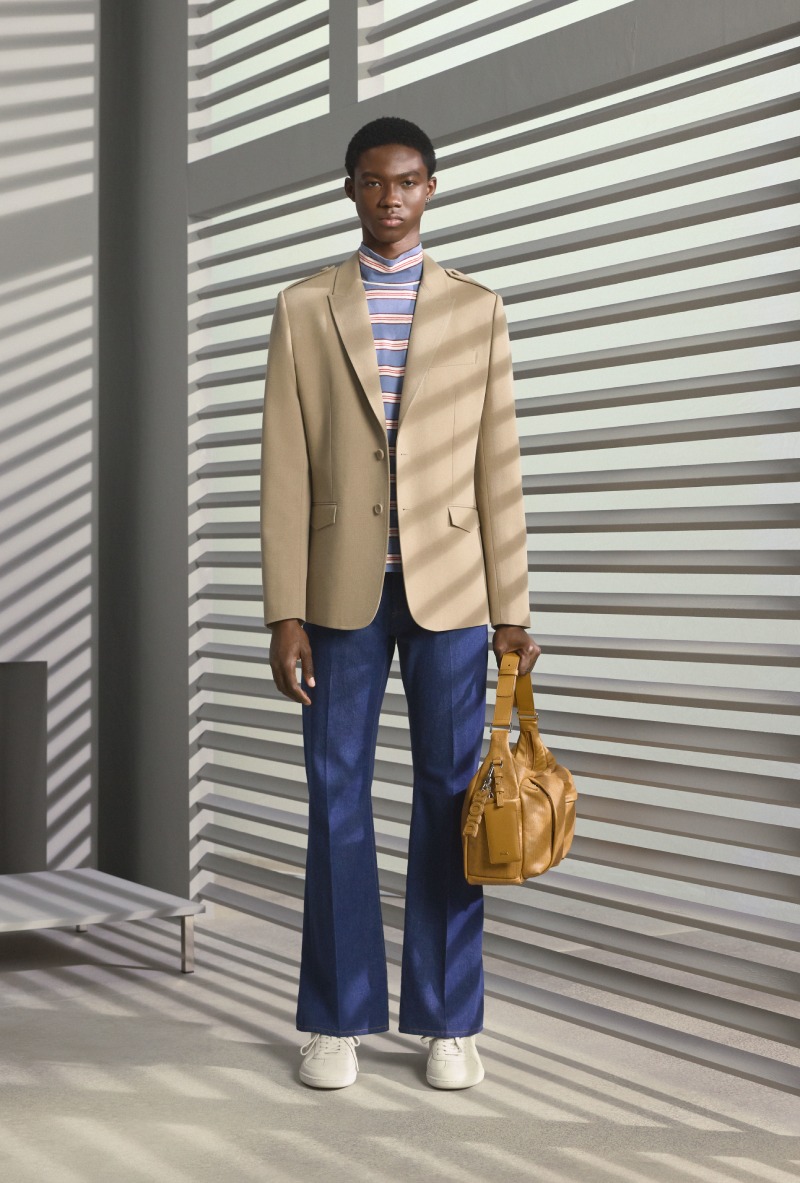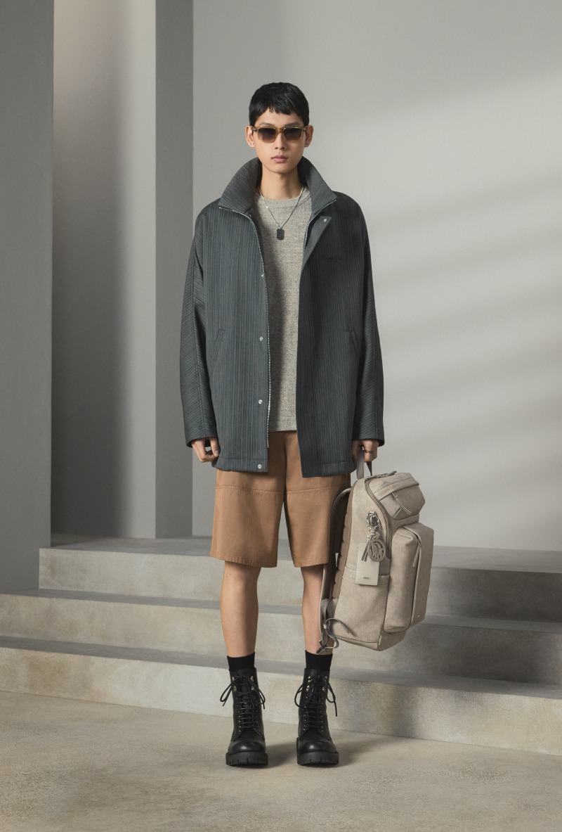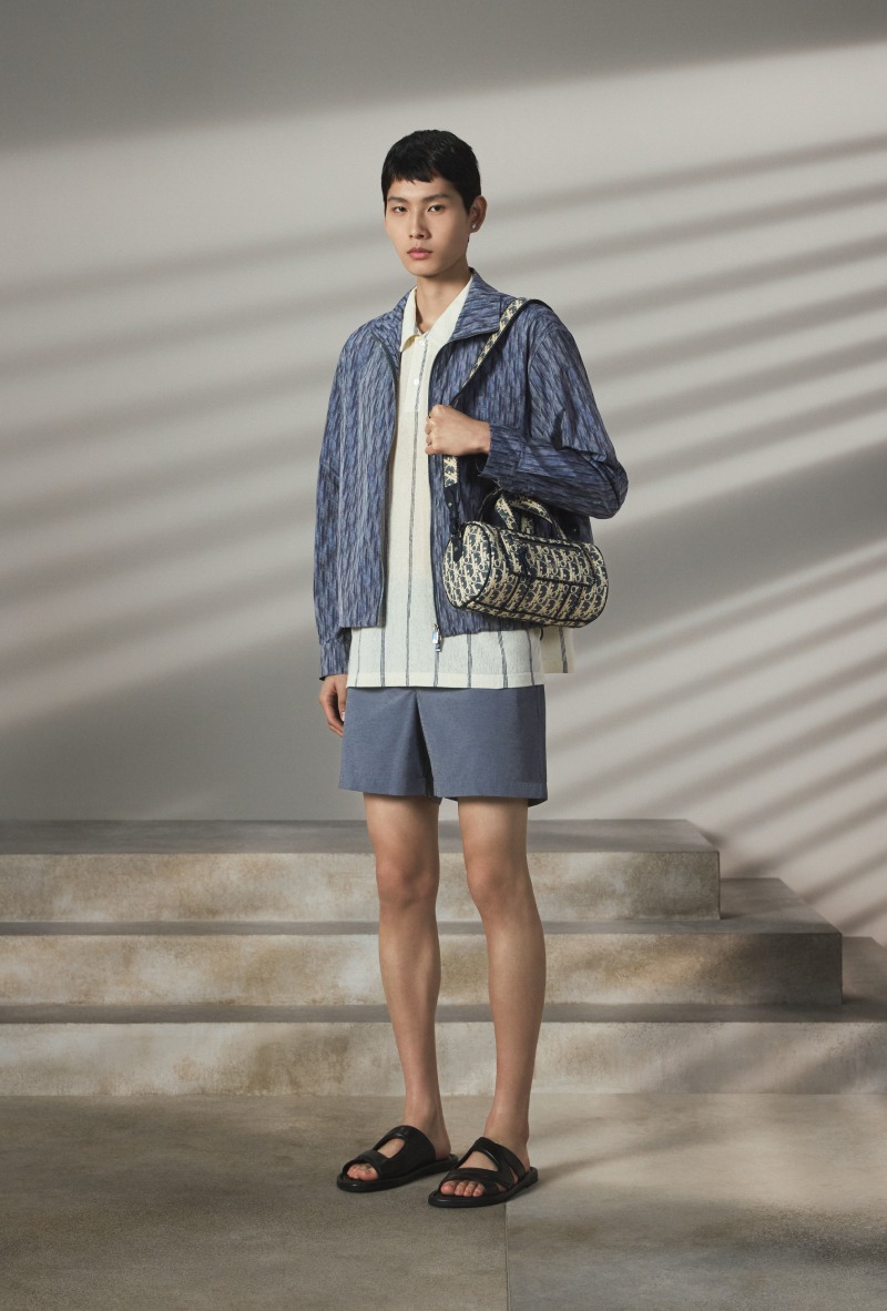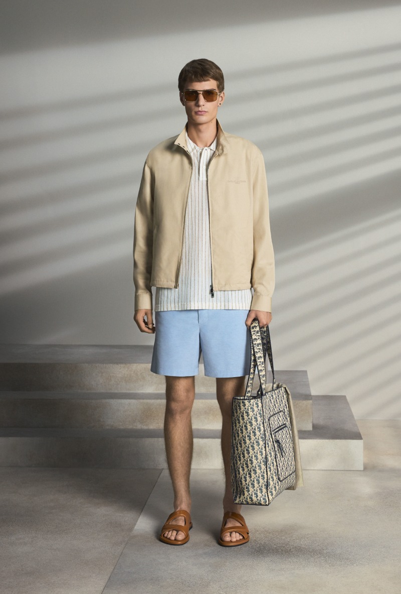 Otro de los puntos fuertes de Dior Men Fall 2025 es el estampado de rayas clásico; otro elemento unificador en estos tipos de armario. Esto resalta dentro del repertorio más casual, dejándose ver en camisetas, jerséis, bermudas, polos de rugby. También tenemos unas bermudas cargo con patrón Oblique y un chaleco utility para cerrar los looks.