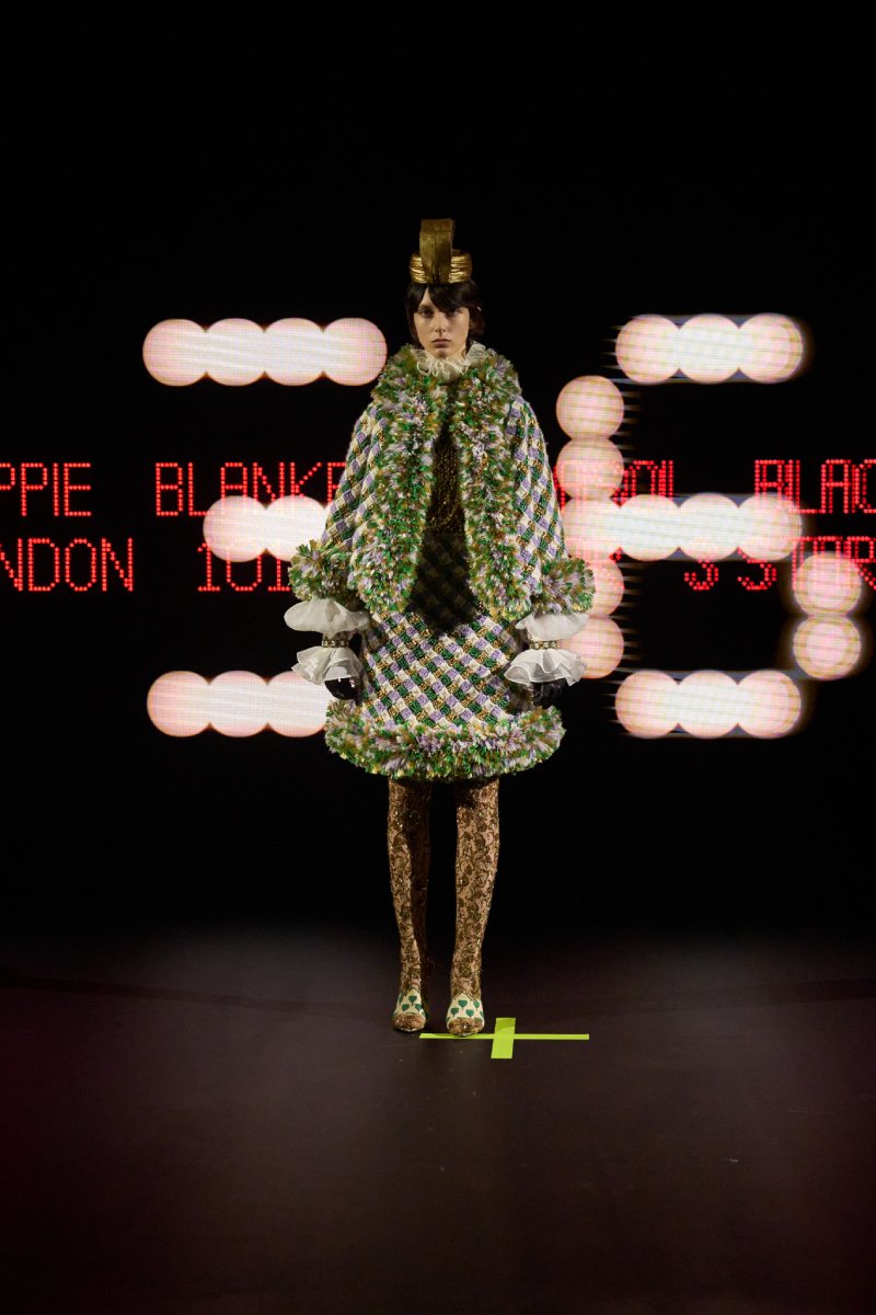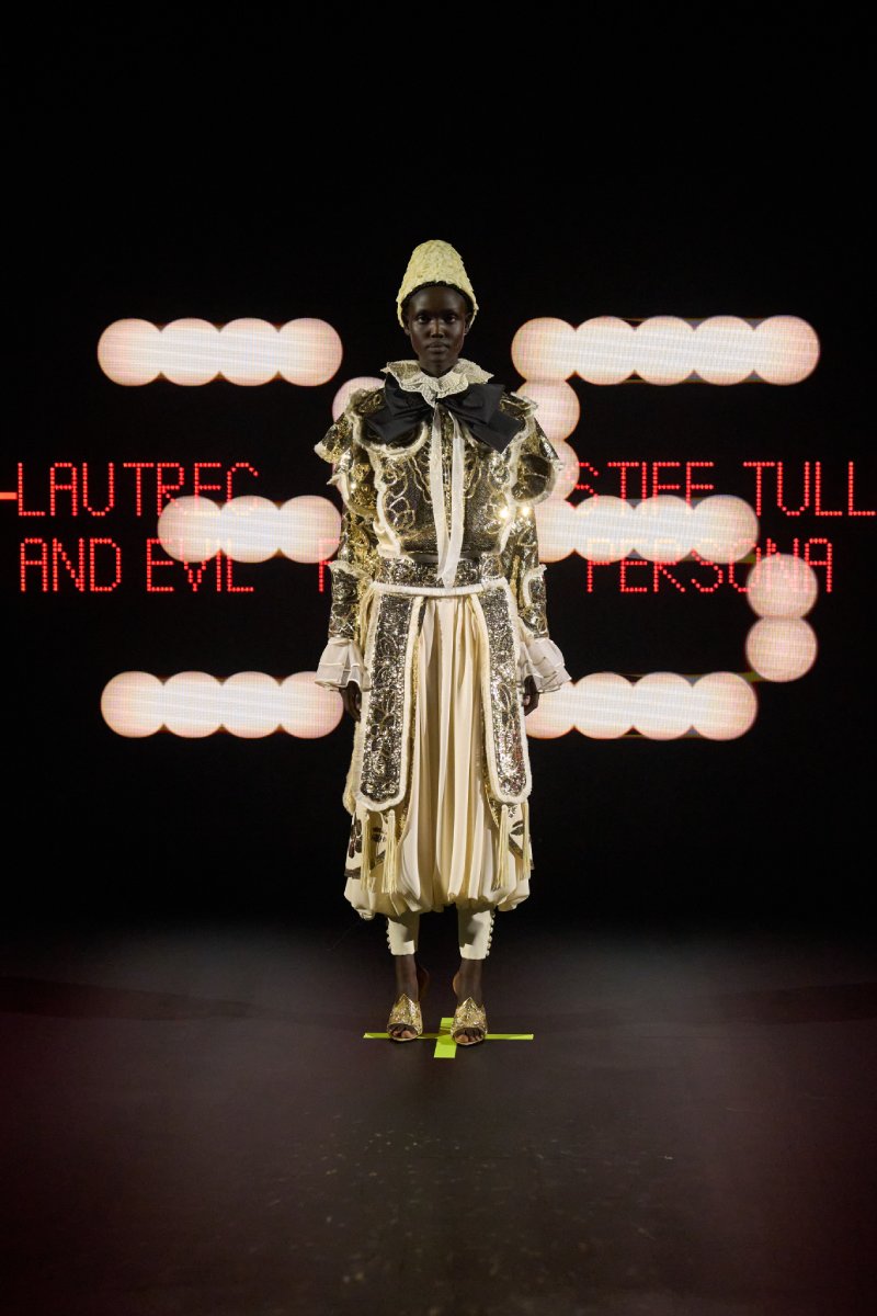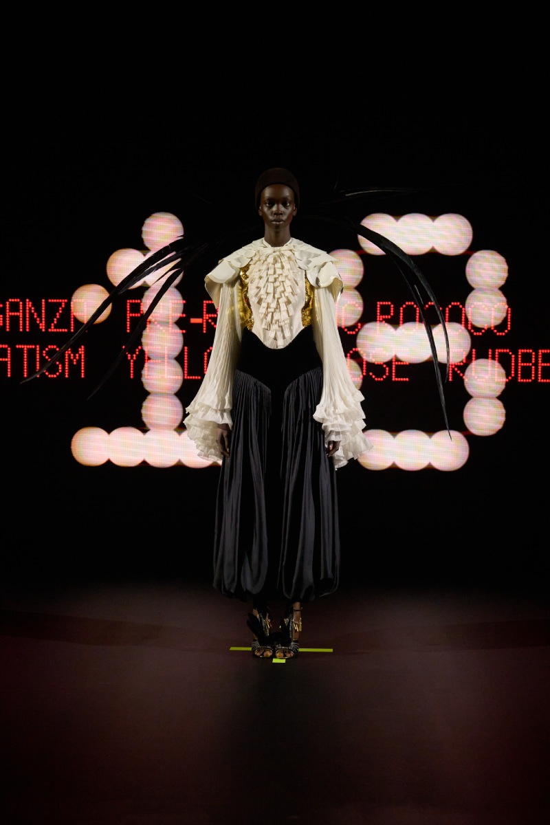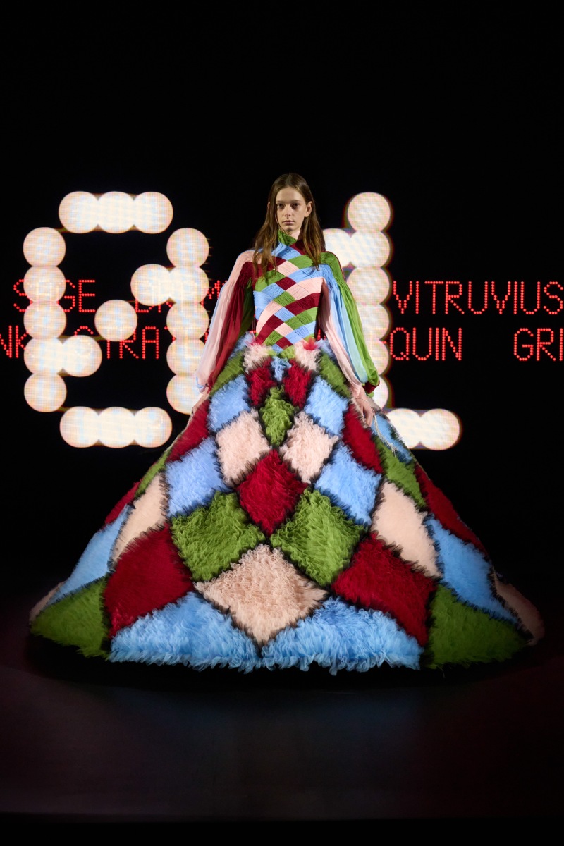 El look inicial de Valentino Alta Costura 2025 es una composición súper compleja de texturas, patrones y siluetas, que crea un patrón Argyle de rombos con segmentos coloreados y fruncidos de tul. Las mangas, un tanto historicistas, acompañan un cuerpo ceñido y trenzado a juego. Entre medias, salen a relucir todos los tropes de su lenguaje: nostalgia setentera, gorgueras blancas, lazos en el cuello, mangas abullonadas, faldas con estructura de crinolina. Todo, claro, con los acabados más estridentes e histriónicos: bordados, lentejuelas, jacquard gráfico, pelo, volúmenes escalonados.
