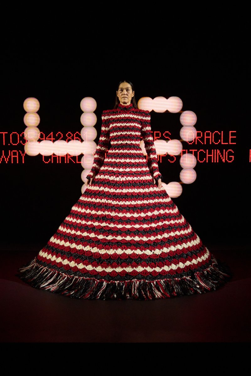 Cerrando este debut, Valentino Alta Costura 2025 muestra un vestido de punto abierto como look de clausura. Este conjunto destaca un cuerpo rígido de hombreras pronunciadas y una falda larga y dramática, rematada por flecos. Y todo, hasta las magas ceñidas y el cuello alto, se hace con nudos en forma de flor que escalonan rojo, blanco y negro.